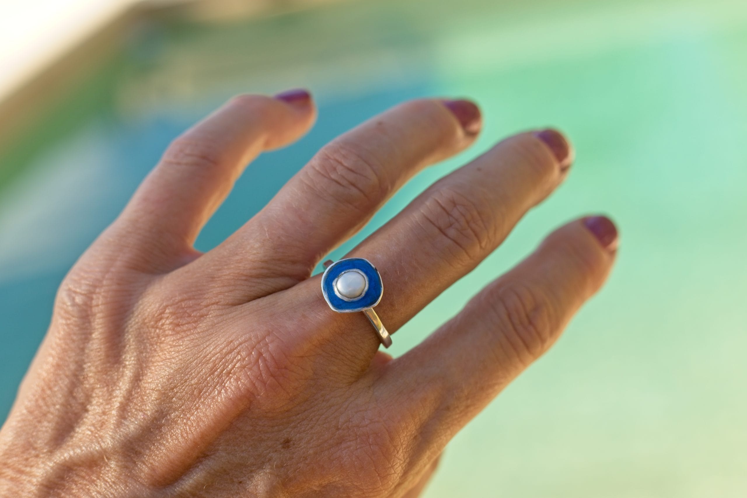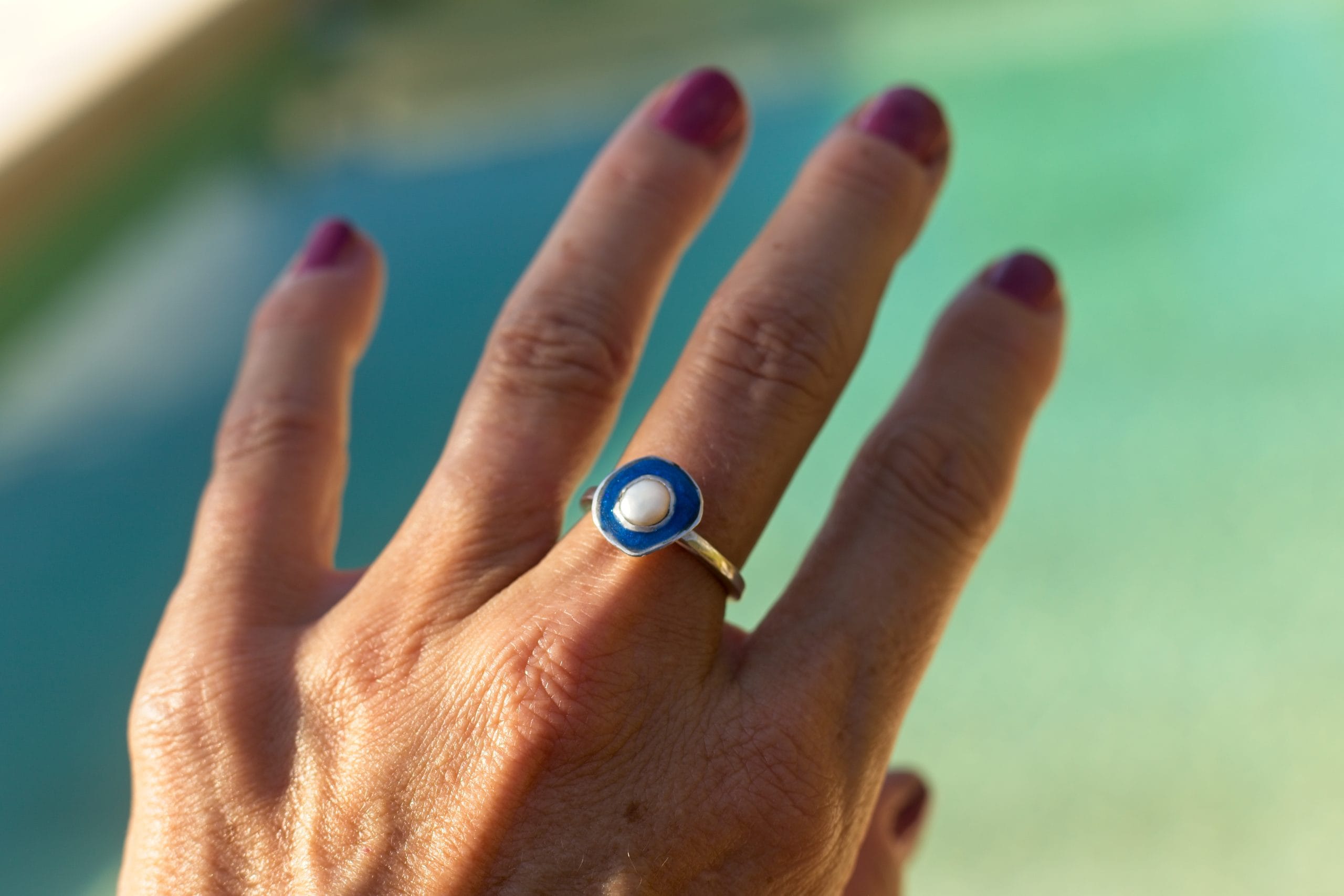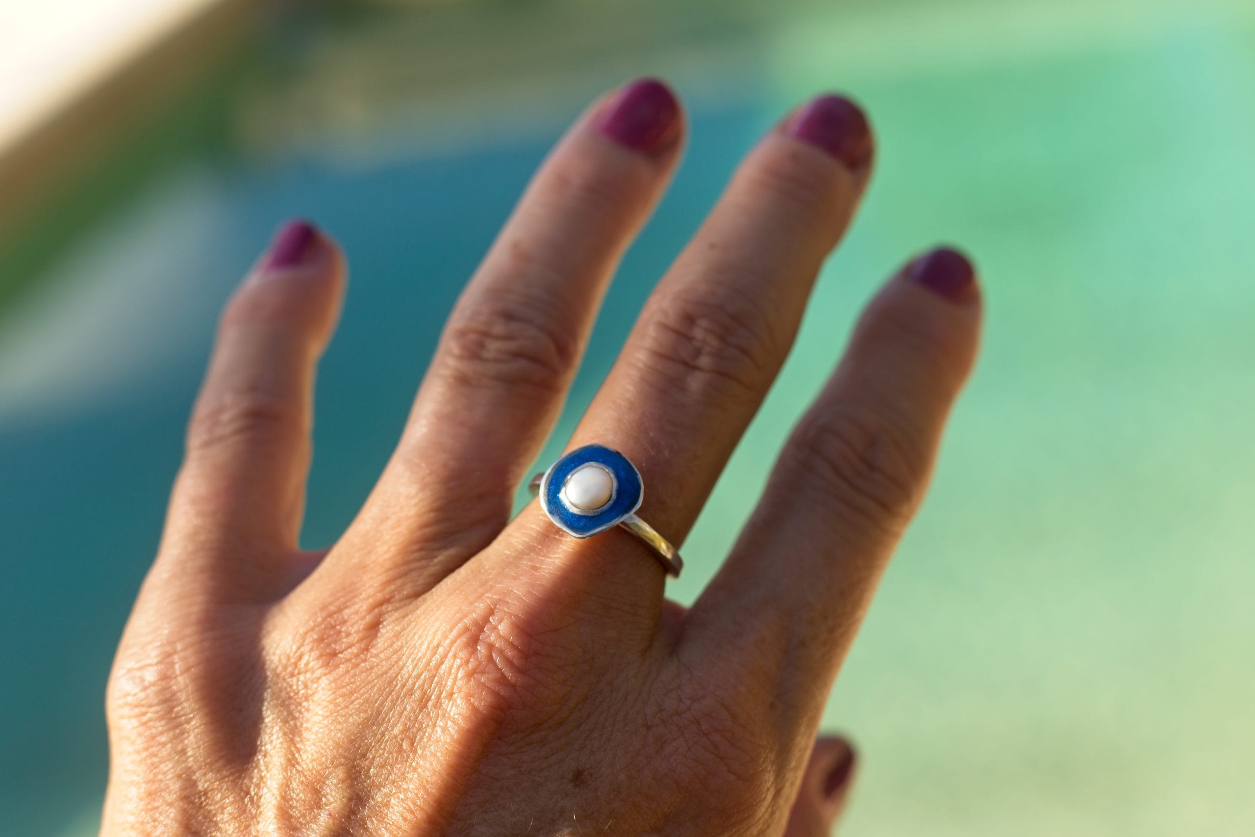 Coastal Cool, Totally Playful. Inject some fun into your jewellery collection! This elegant Azure Pool Pearl Ring features a delightful central bowl filled with vibrant blue resin, reminiscent of a tiny azure pool. Floating in the centre is a luminous Cultivated River Pearl. It’s a cheerful, artistic piece that perfectly captures the playful spirit of the Costa. A refreshing splash of blue for your hand.