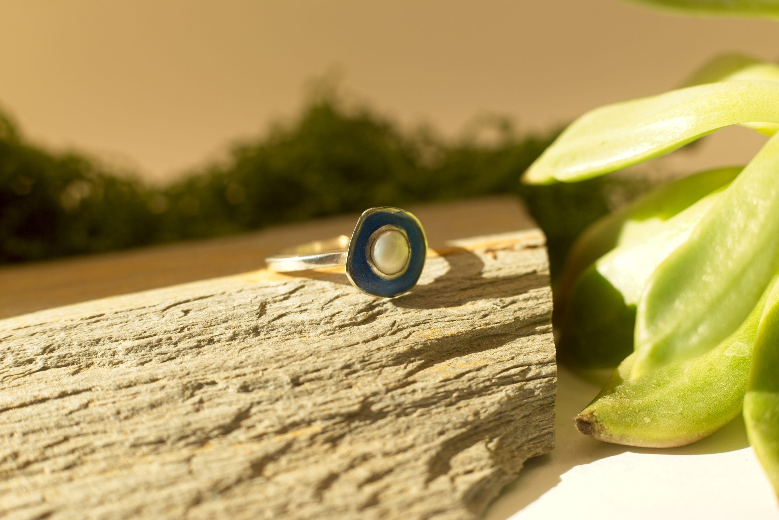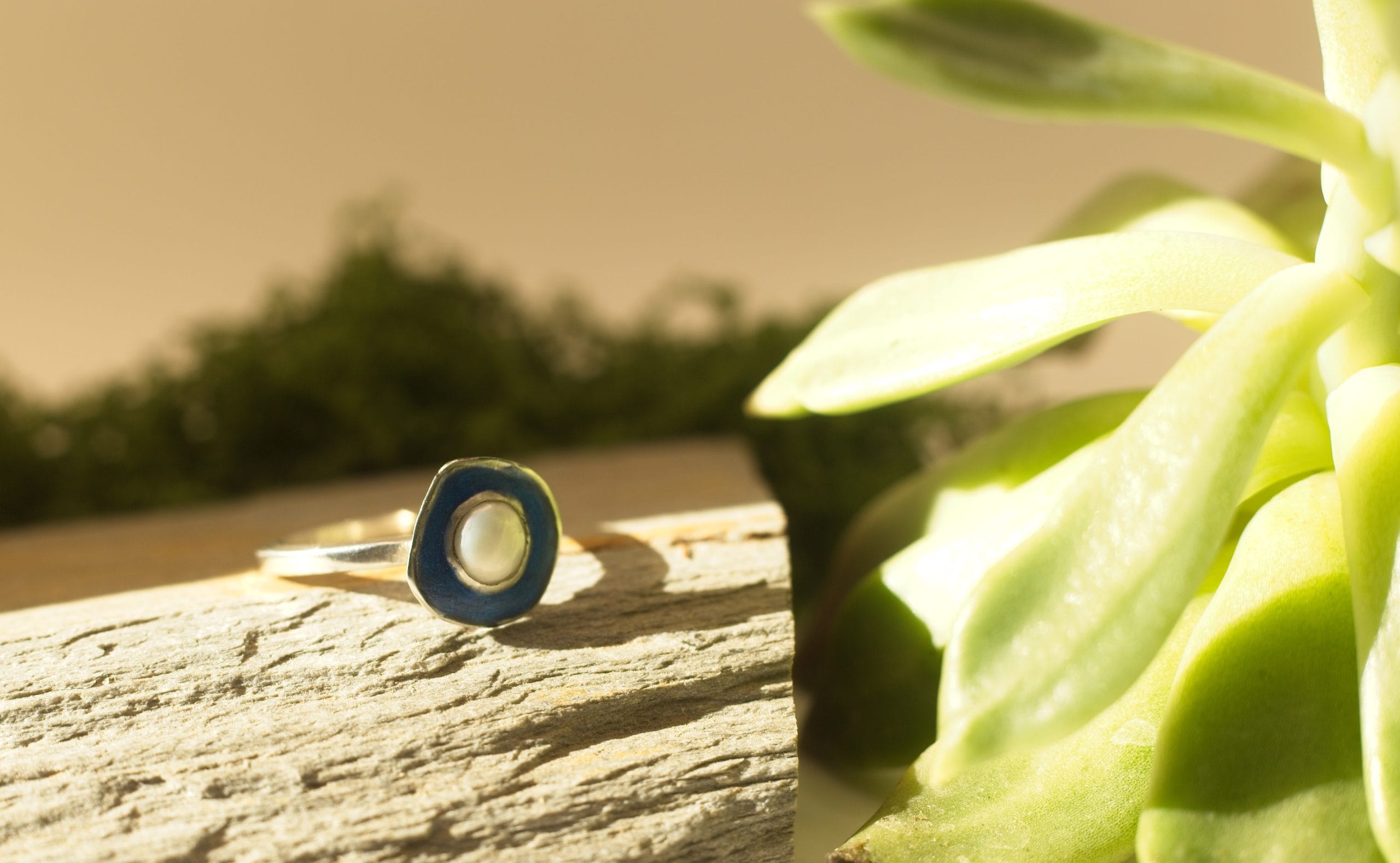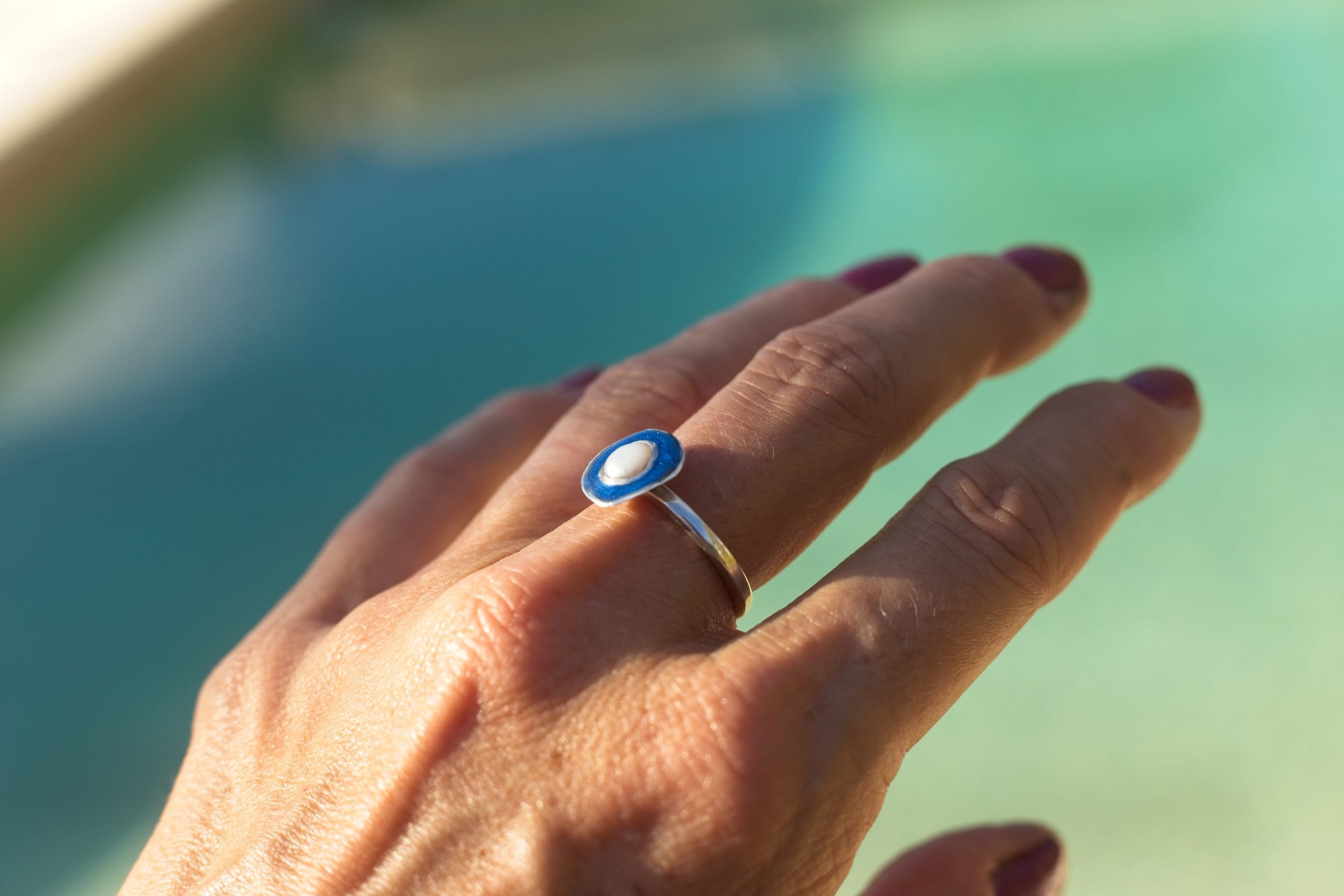 Coastal Cool, Totally Playful. Inject some fun into your jewellery collection! This elegant Azure Pool Pearl Ring features a delightful central bowl filled with vibrant blue resin, reminiscent of a tiny azure pool. Floating in the centre is a luminous Cultivated River Pearl. It’s a cheerful, artistic piece that perfectly captures the playful spirit of the Costa. A refreshing splash of blue for your hand.