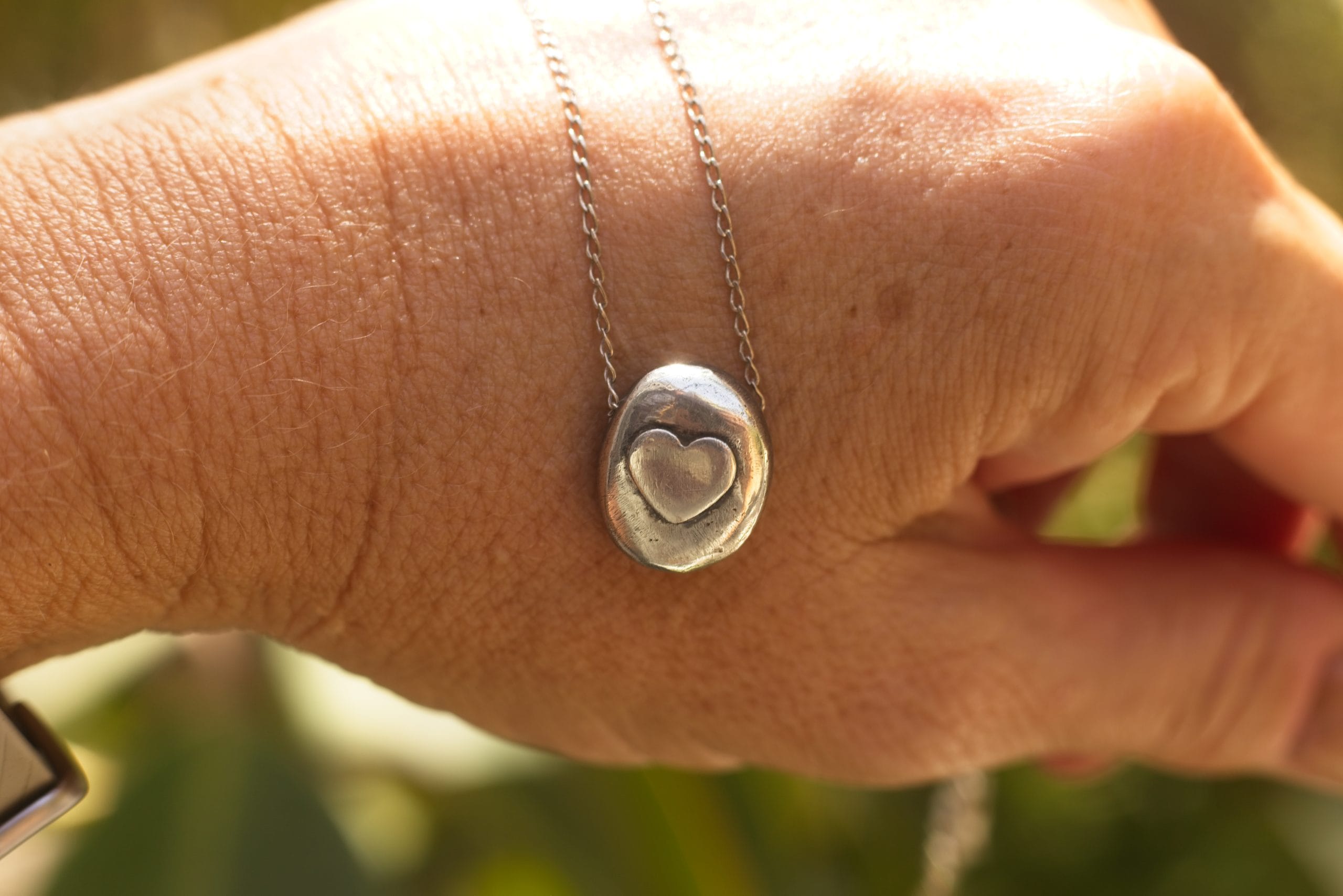 Capture a piece of the Spanish coast with this unique necklace. This tactile piece is an exact replica of a smooth pebble found on the beach in Sotogrande, Cádiz. It’s made from fine silver and features a high-shine heart, adding a touch of elegance to its natural, organic shape.