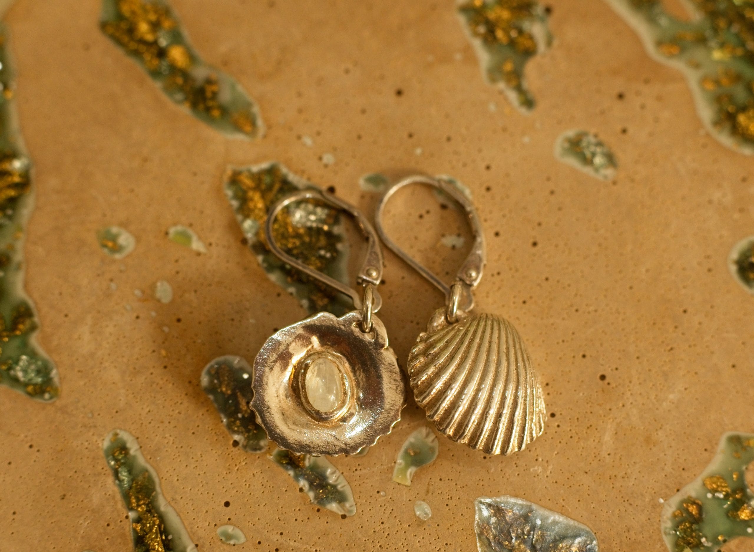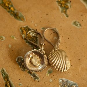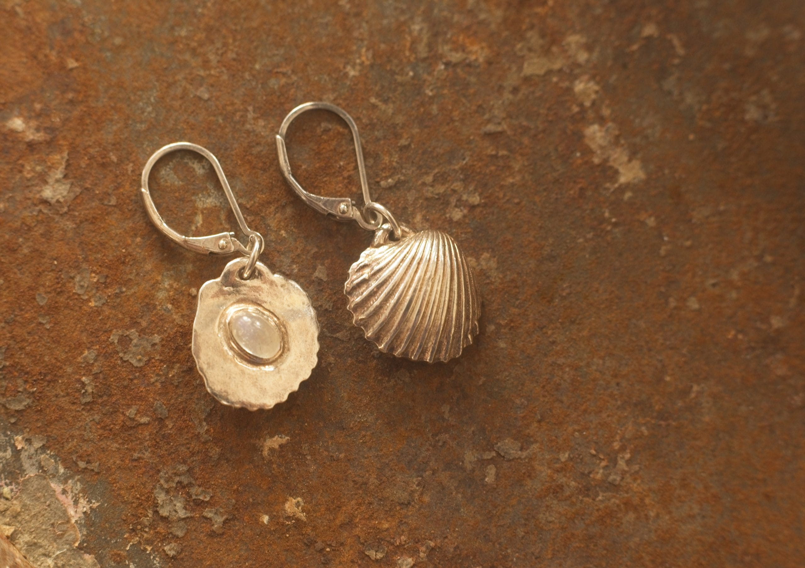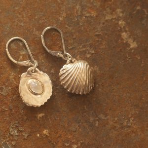 A unique feature of these earrings is the moonstone set on the rear side of each shell. This allows the stones to catch the light as you move, or you can reverse them to show the moonstones for a completely different look.