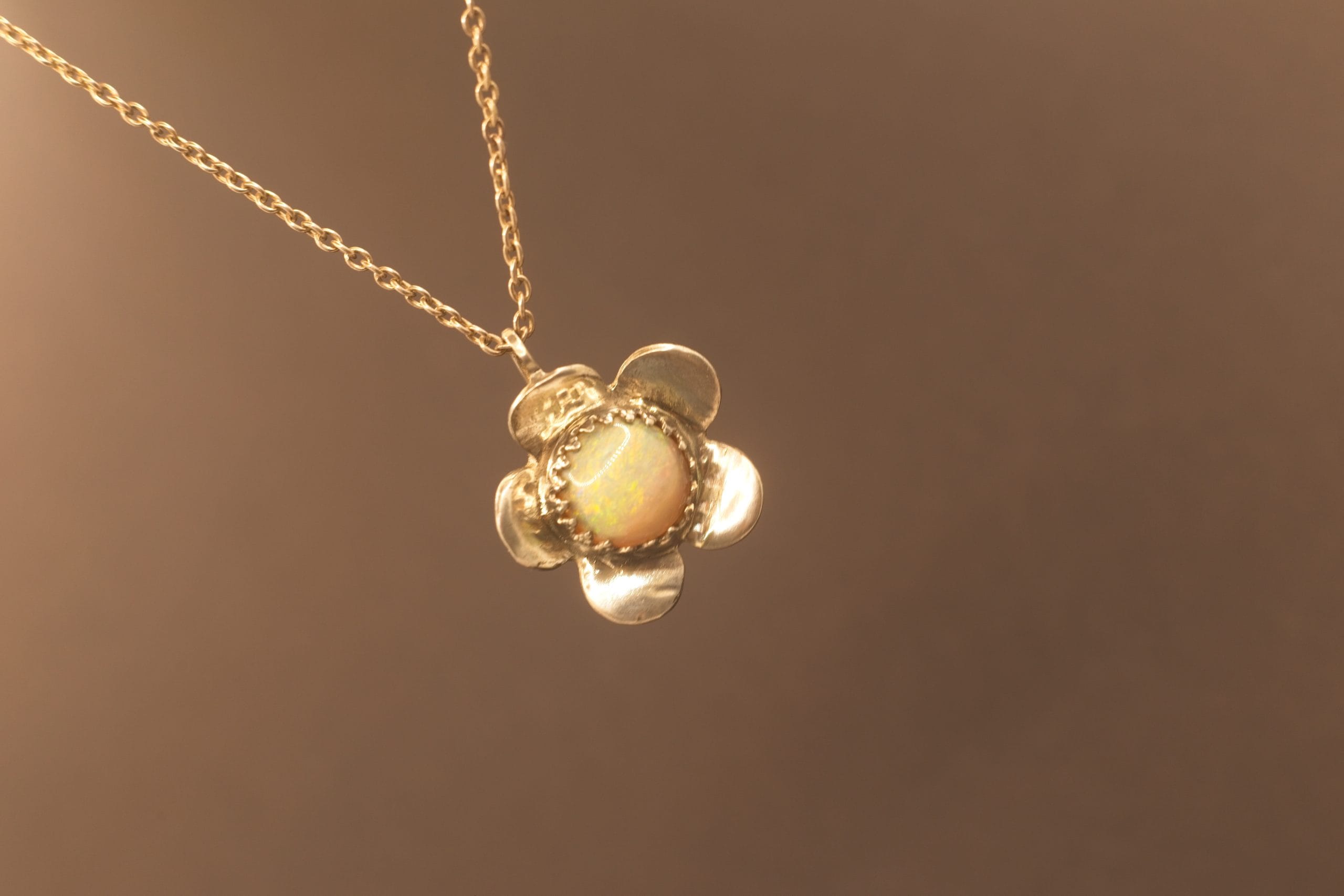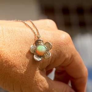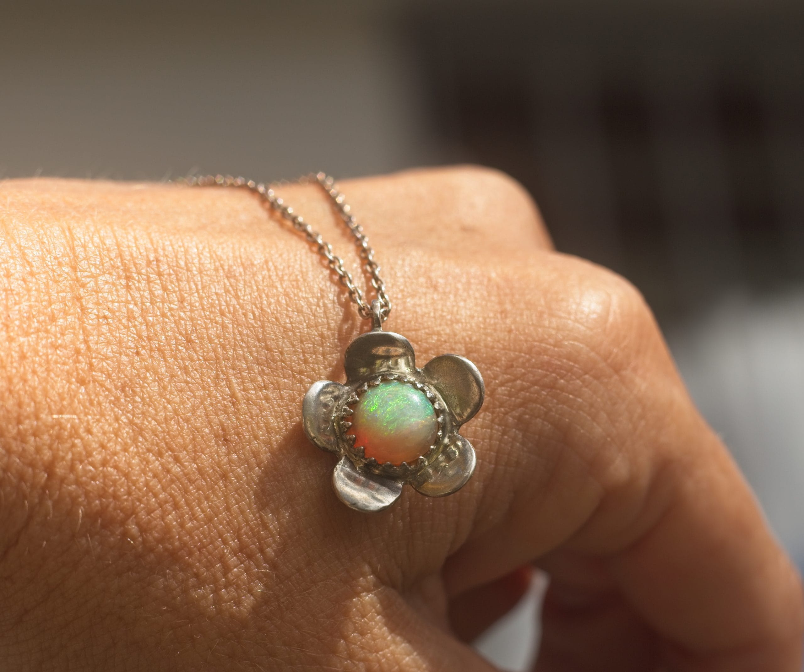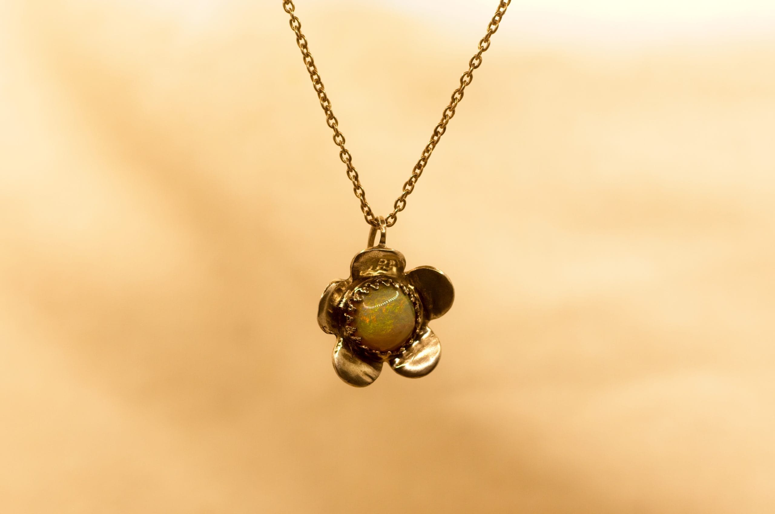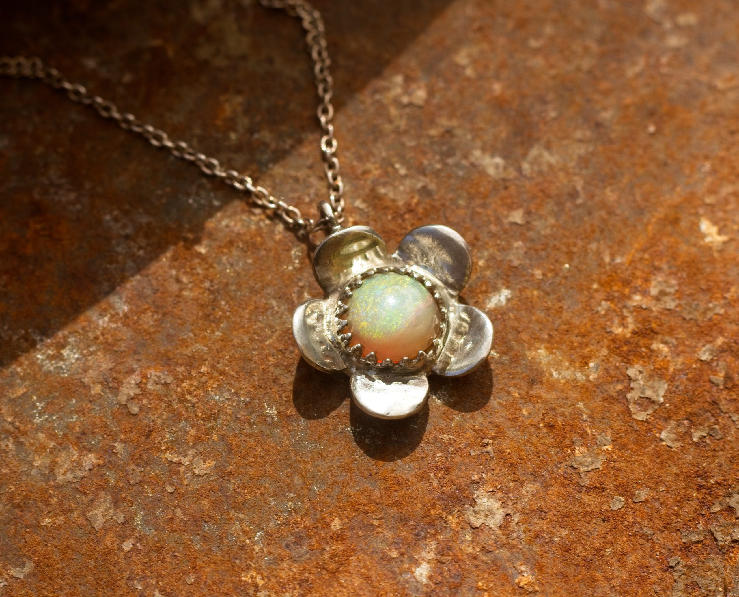 This exquisite piece is a heartfelt ode to the vibrant colours of the natural world. A simple, beautifully sculpted fine silver flower perfectly frames a breathtaking green and yellow fleck opal, which shimmers with life from its centre. Revered for centuries as a stone of hope, passion, and creativity, the opal brings meaningful depth to this elegant design. Suspended from a delicate yet robust 40cm sterling silver chain, which features an integrated extension to 46cm for versatile styling, this pendant is a beautiful touch of bespoke luxury to cherish.