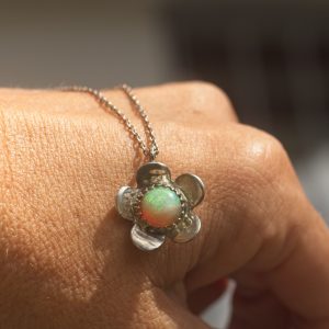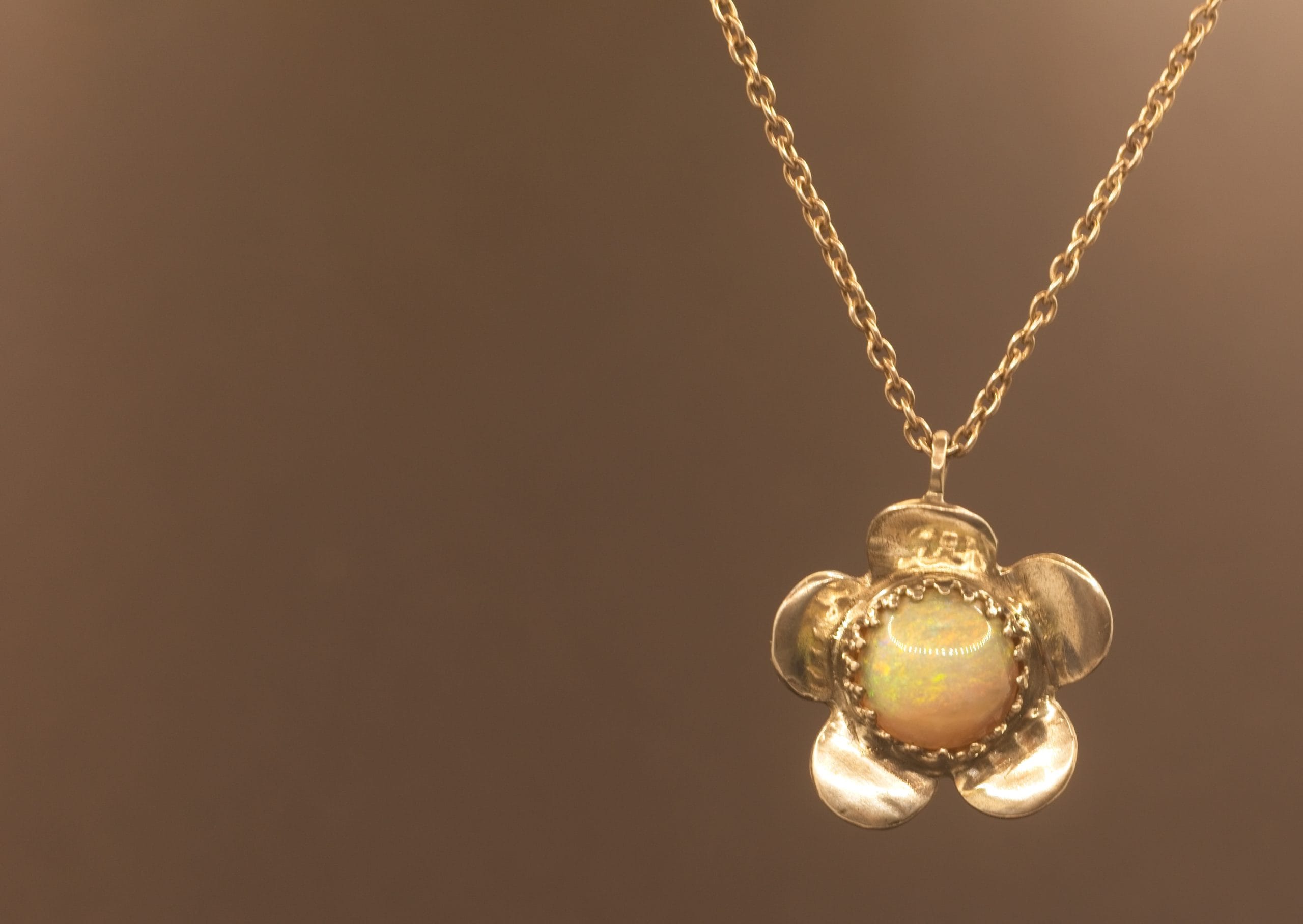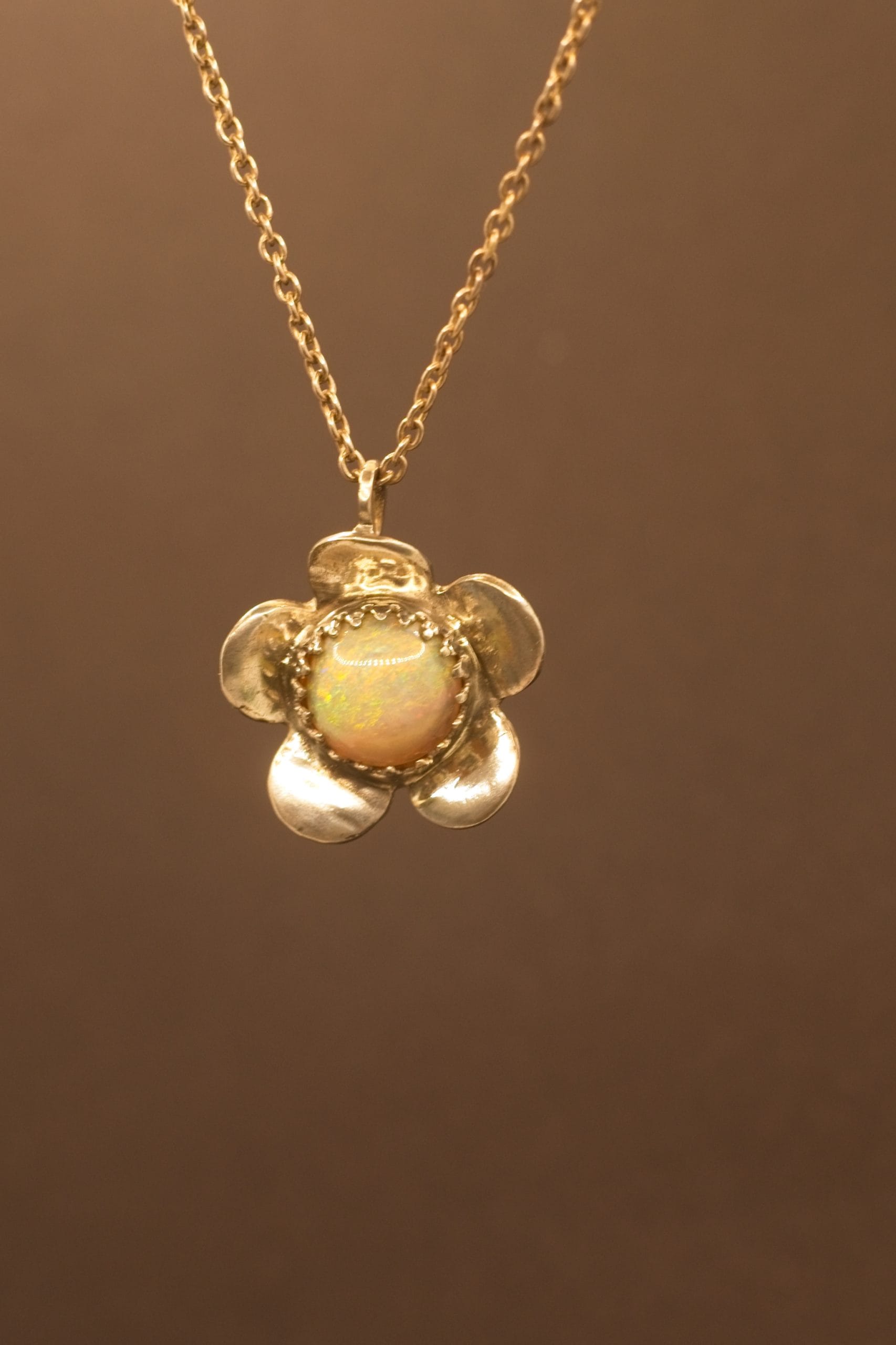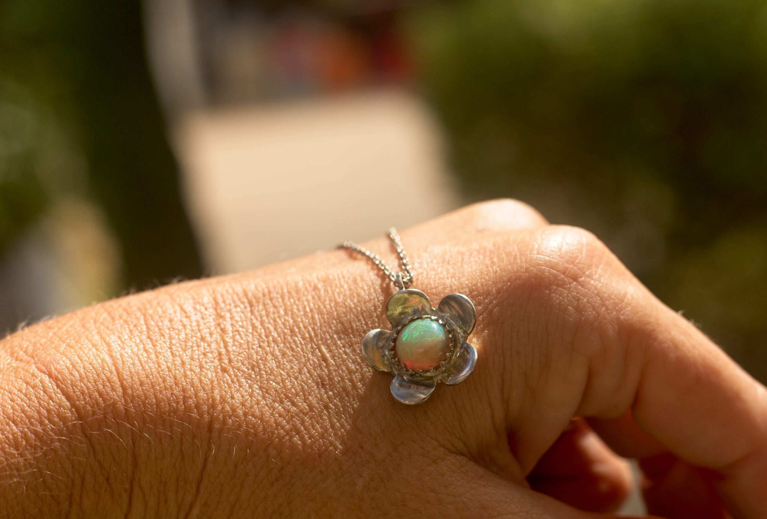 This exquisite piece is a heartfelt ode to the vibrant colours of the natural world. A simple, beautifully sculpted fine silver flower perfectly frames a breathtaking green and yellow fleck opal, which shimmers with life from its centre. Revered for centuries as a stone of hope, passion, and creativity, the opal brings meaningful depth to this elegant design. Suspended from a delicate yet robust 40cm sterling silver chain, which features an integrated extension to 46cm for versatile styling, this pendant is a beautiful touch of bespoke luxury to cherish.