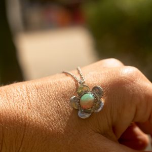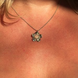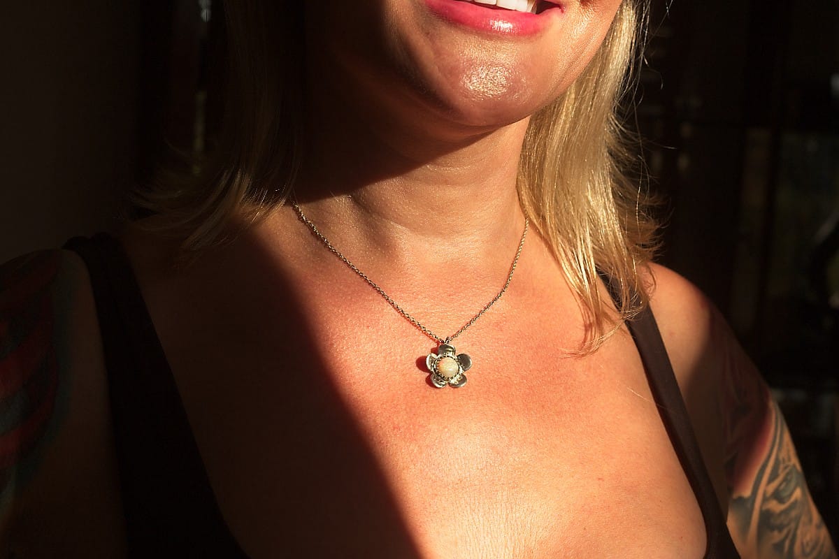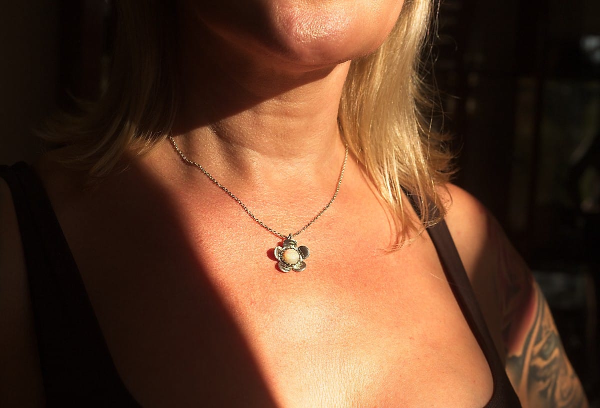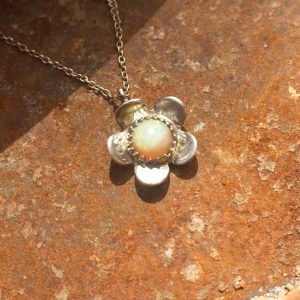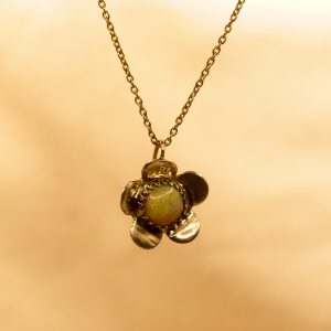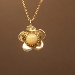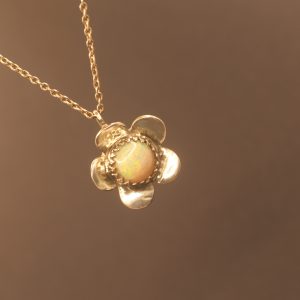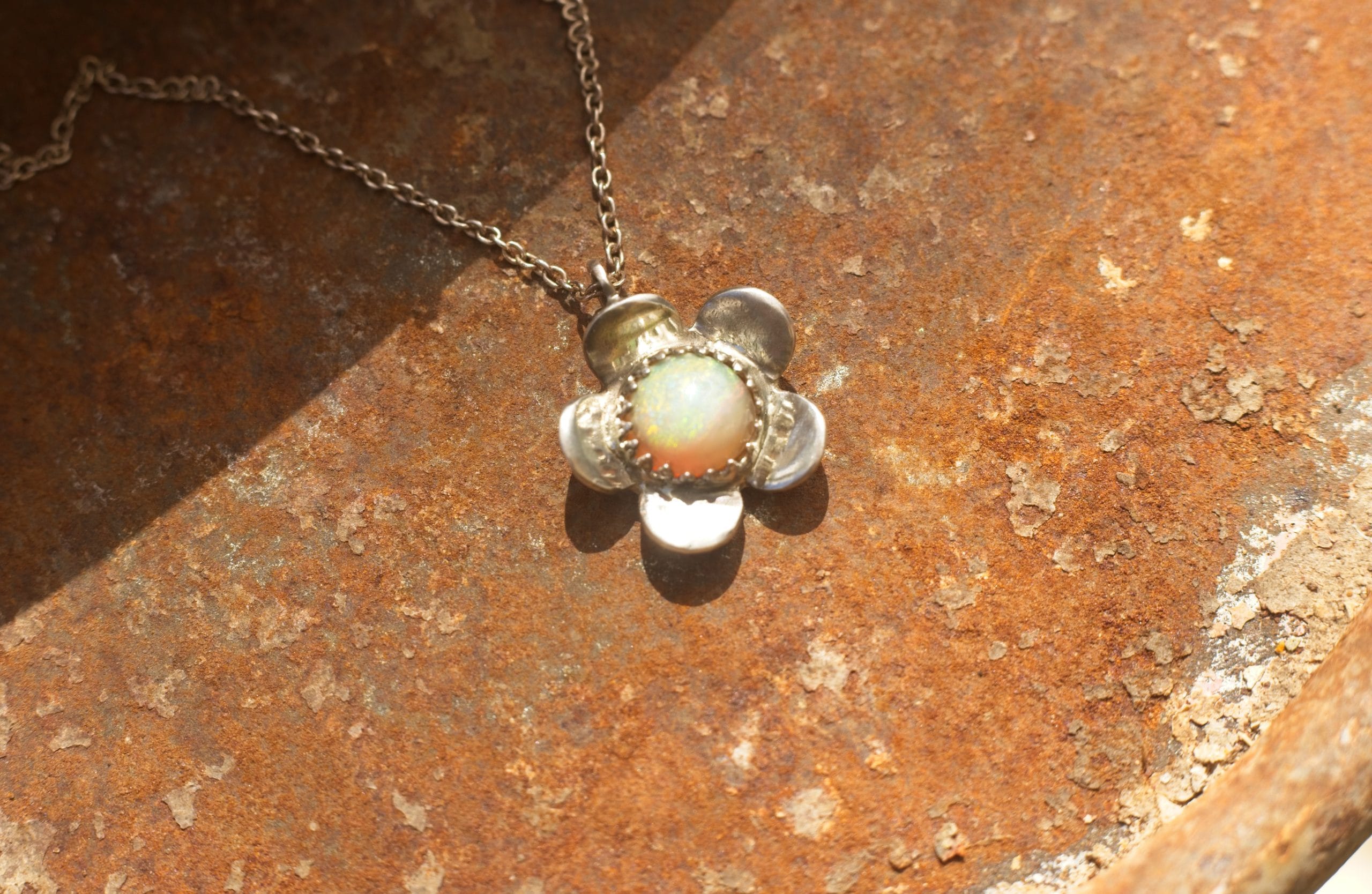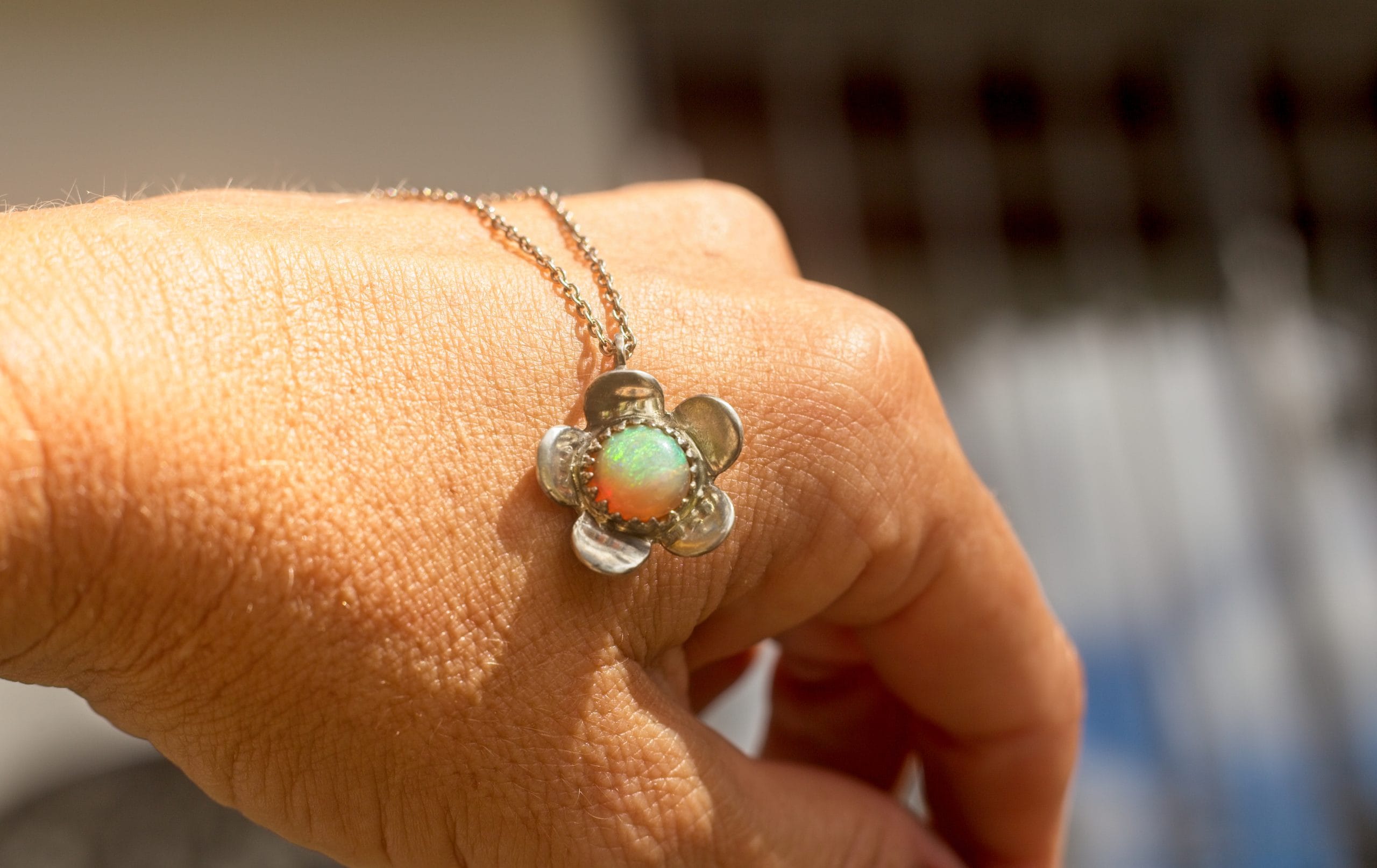 This exquisite piece is a heartfelt ode to the vibrant colours of the natural world. A simple, beautifully sculpted fine silver flower perfectly frames a breathtaking green and yellow fleck opal, which shimmers with life from its centre. Revered for centuries as a stone of hope, passion, and creativity, the opal brings meaningful depth to this elegant design. Suspended from a delicate yet robust 40cm sterling silver chain, which features an integrated extension to 46cm for versatile styling, this pendant is a beautiful touch of bespoke luxury to cherish.