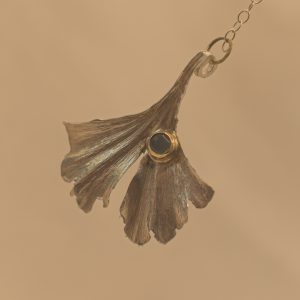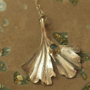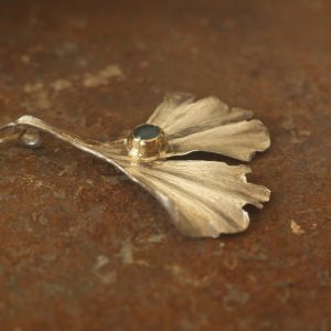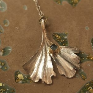 Real gingko leaf formed into silver, with a chalcedony set in 9ct gold.