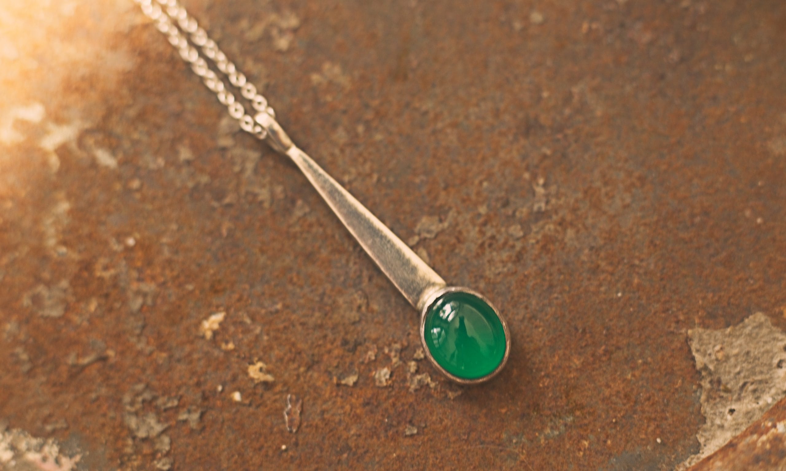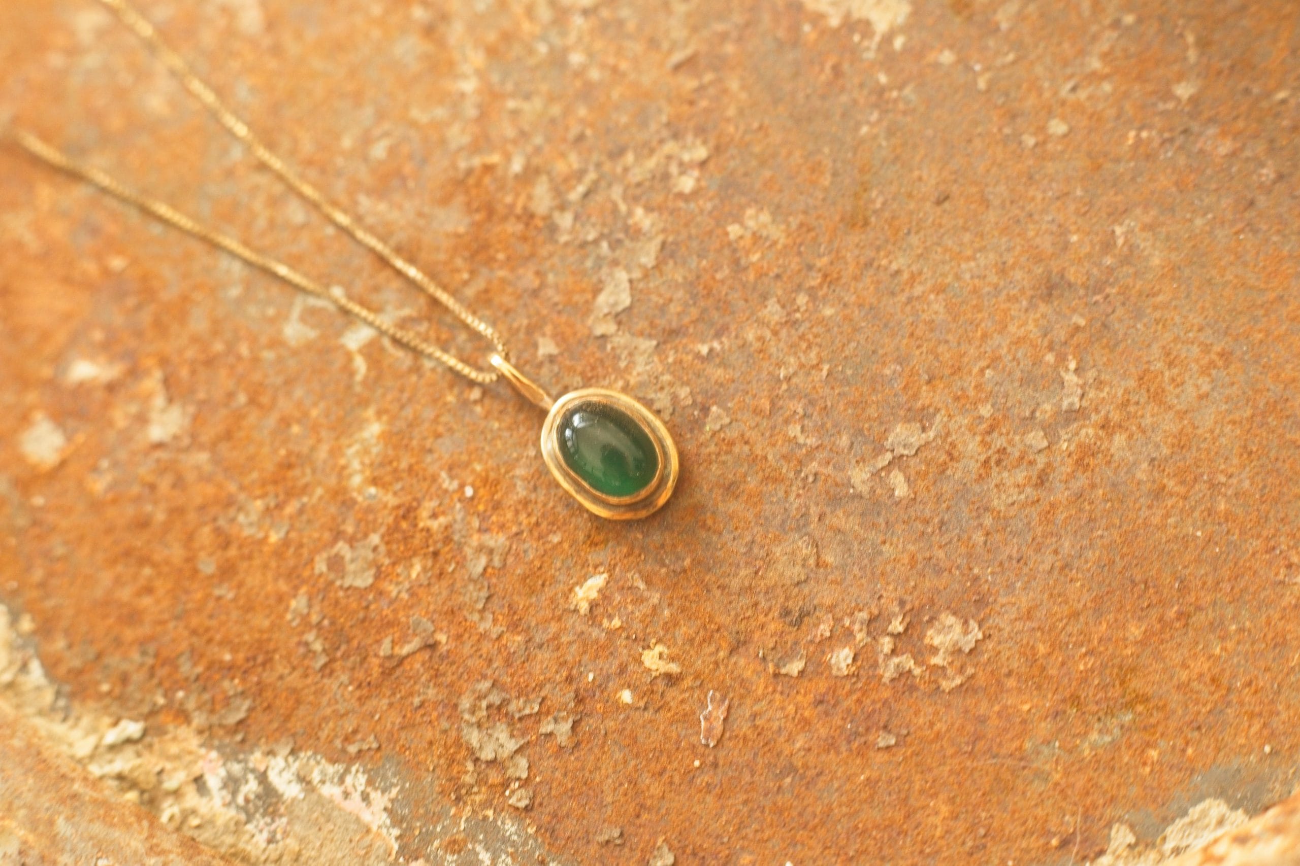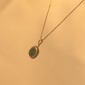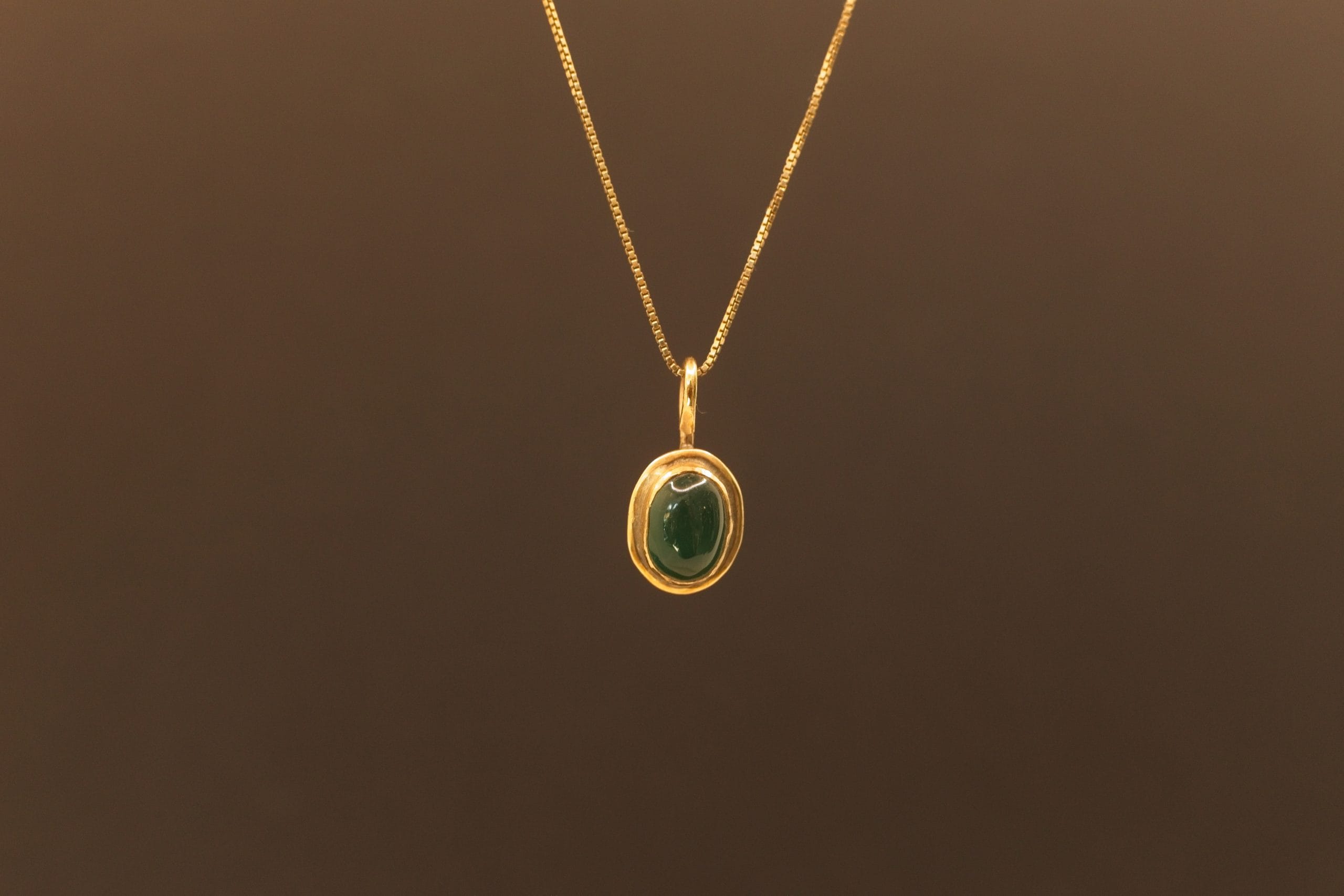A piece of truly timeless luxury, this striking oval pendant has the captivating feel of a treasured heirloom. A flawless green onyx cabochon is showcased in a refined, traditional 9ct gold setting, its substantial border and rich patina giving it an immediate antiqued appeal. This classic design is beautifully suspended from a 44cm gold-filled chain, delivering a dose of unstated glamour with the character of a beloved vintage find.