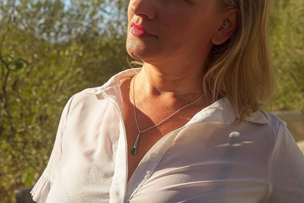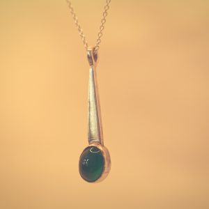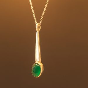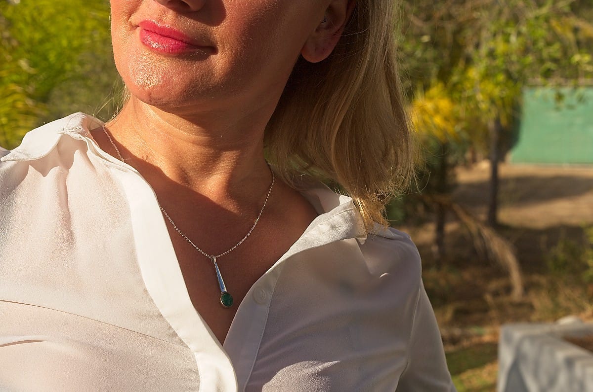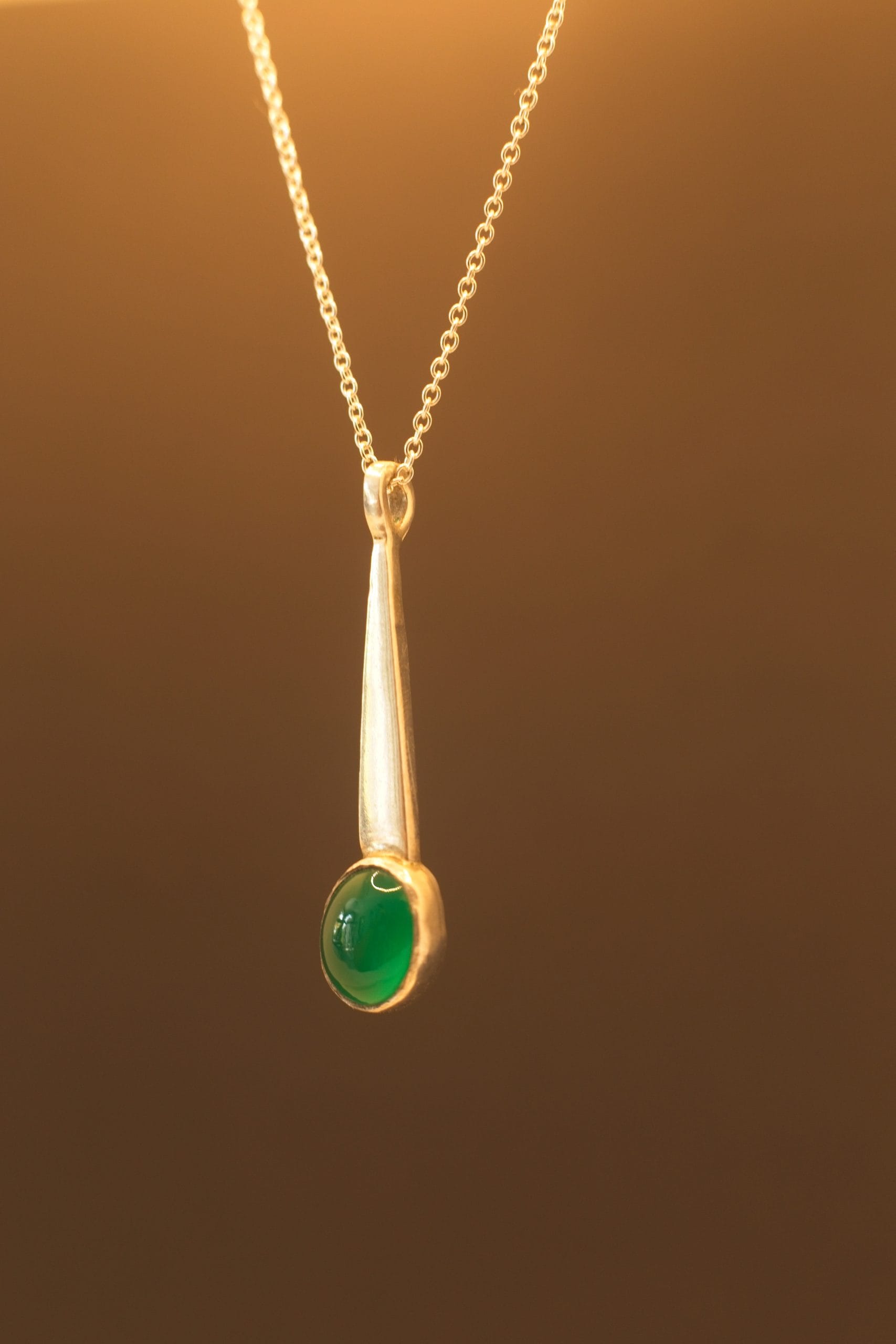 Embodying sleek, minimalist luxury, this striking pendant features a simple, polished fine silver bar design. At its base, a vibrant, perfectly cut green onyx cabochon sits—a gemstone prized for its deep colour and association with strength and emotional healing. The clean lines and bold colour create an effortless statement piece, suspended from a beautiful 46cm sterling silver chain.