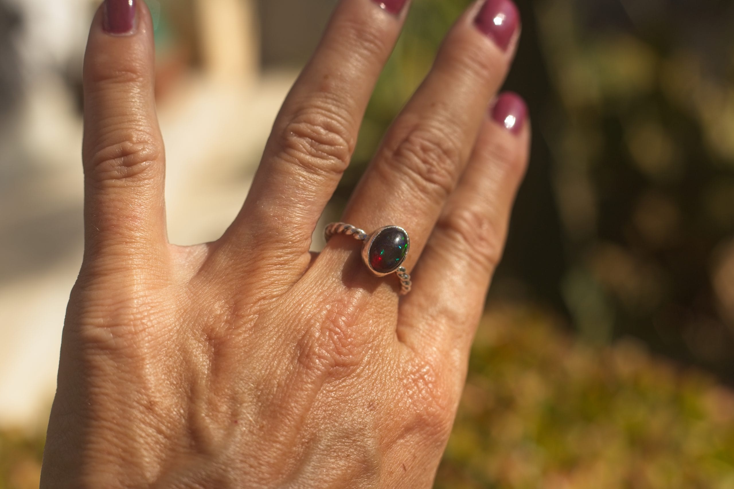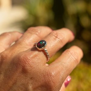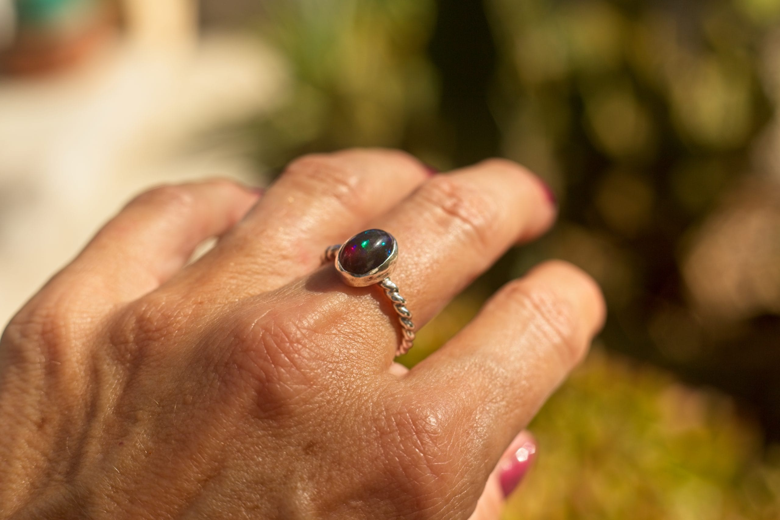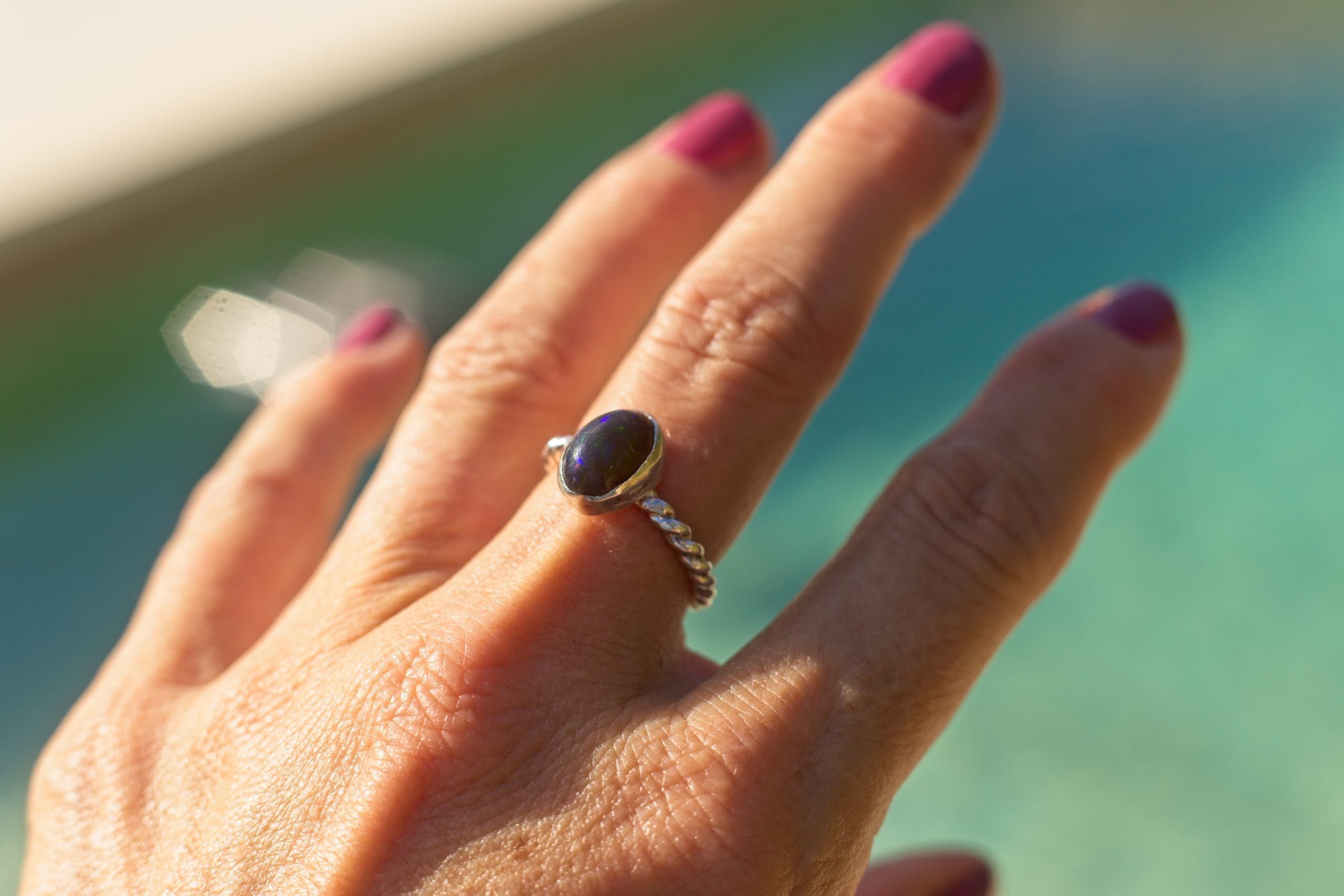 Ocean Dreams on Your Finger. Capture the iridescent flash of the sea in a single, stunning piece. This Laguna Dream Opal Ring beautifully frames a gorgeous 12×9mm oval Opal cabochon. The opal’s legendary play-of-colour shifts with the light, making it a captivating treasure for sunny days and moonlit nights. Set in polished sterling silver, it’s comfortable, chic, and totally mesmerizing. Wear the magic of the Mediterranean.