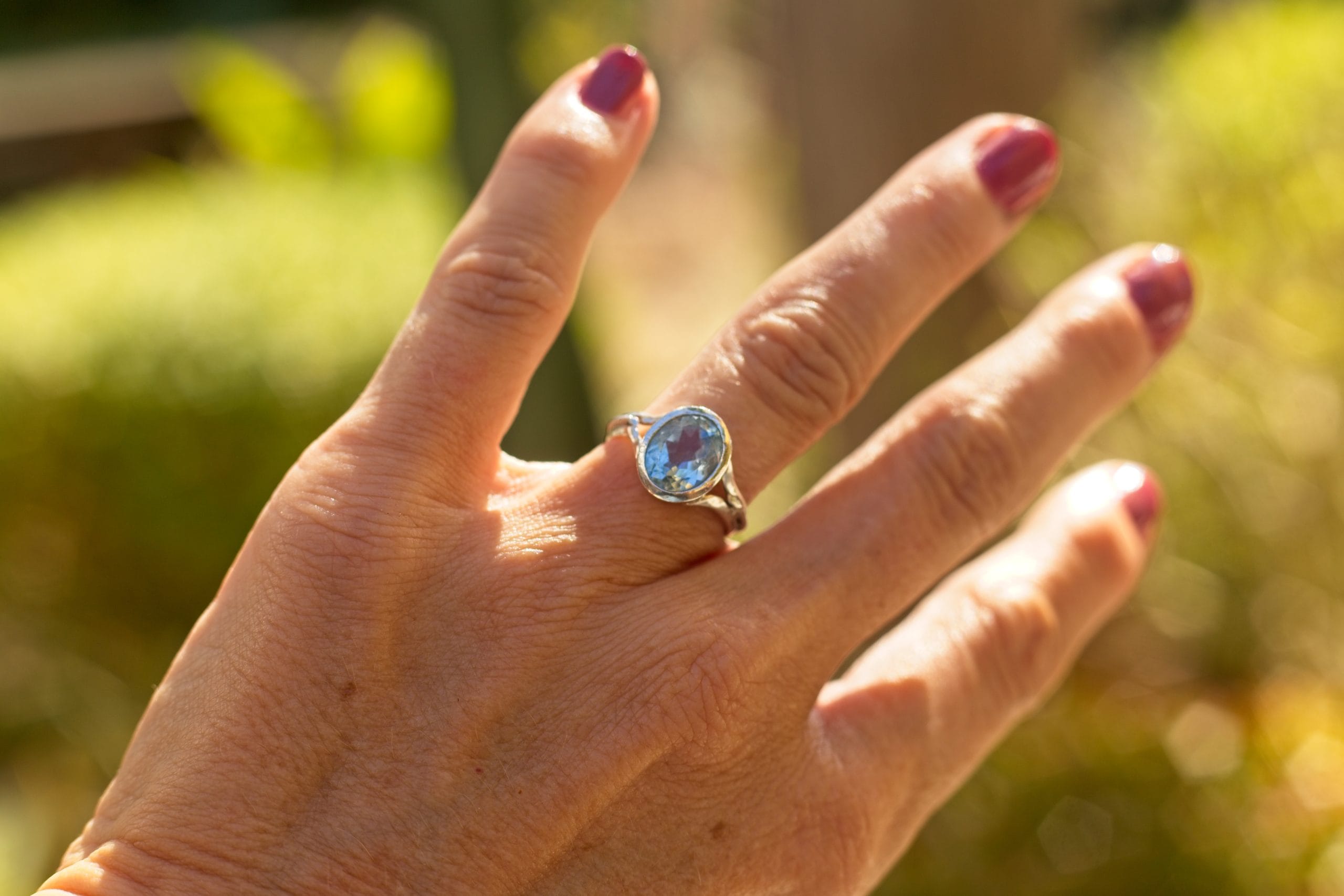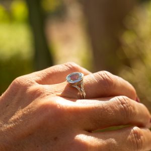 The Colour of a Perfect Costa Sky. Meet your new favourite conversation starter. This striking Ornate Silver Ring is a masterpiece of twisted silver wire, creating a dramatic, feminine frame for a colossal 12×10mm Sky Blue Topaz. The high bezel setting lifts the stone, letting the sun dance through its perfect colour. This is a bold, beautiful piece for your most glamorous sun-drenched moments.