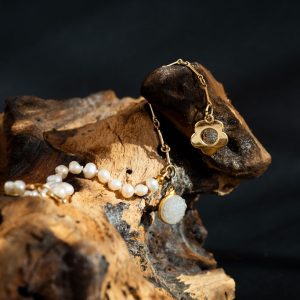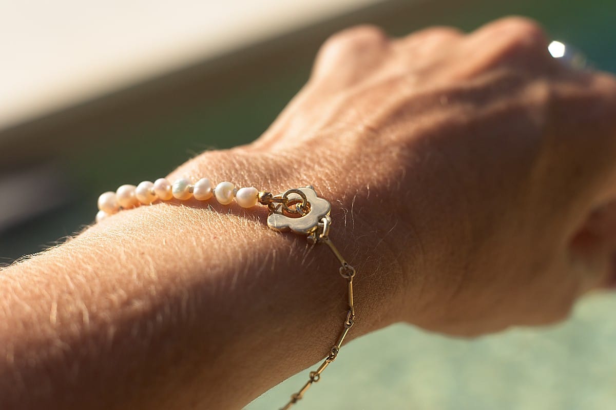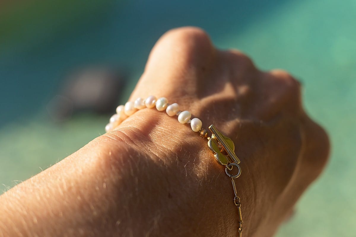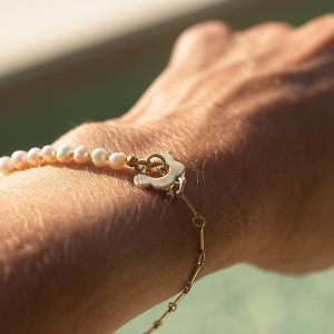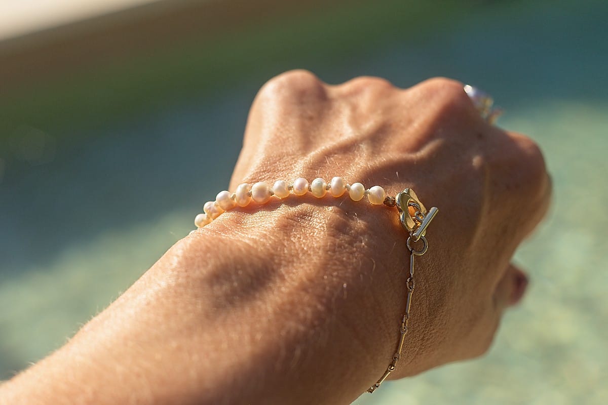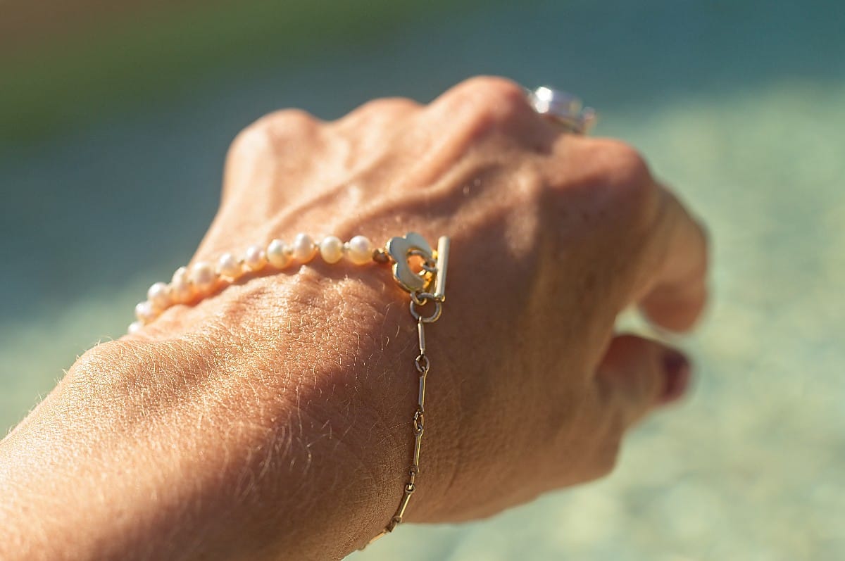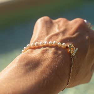 Elevate your wrist with this sophisticated 20.5cm bracelet. It seamlessly blends luxurious materials, featuring luminous freshwater cultured pearls strung alongside a delicate gold-filled bar chain.