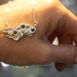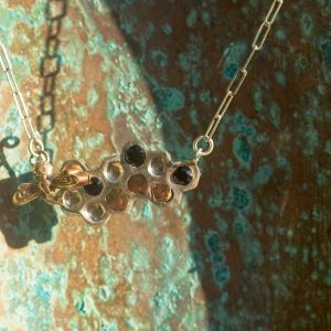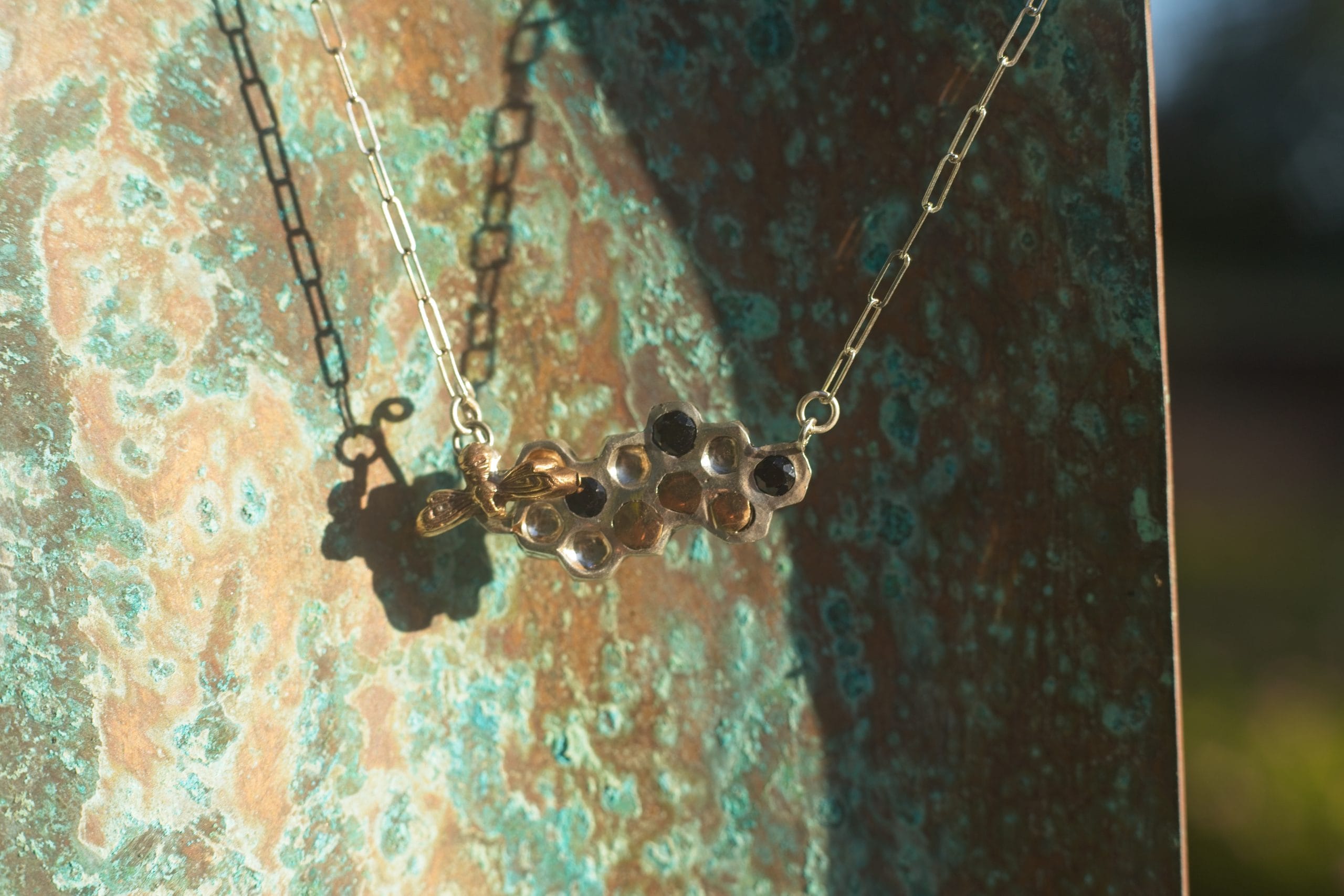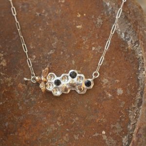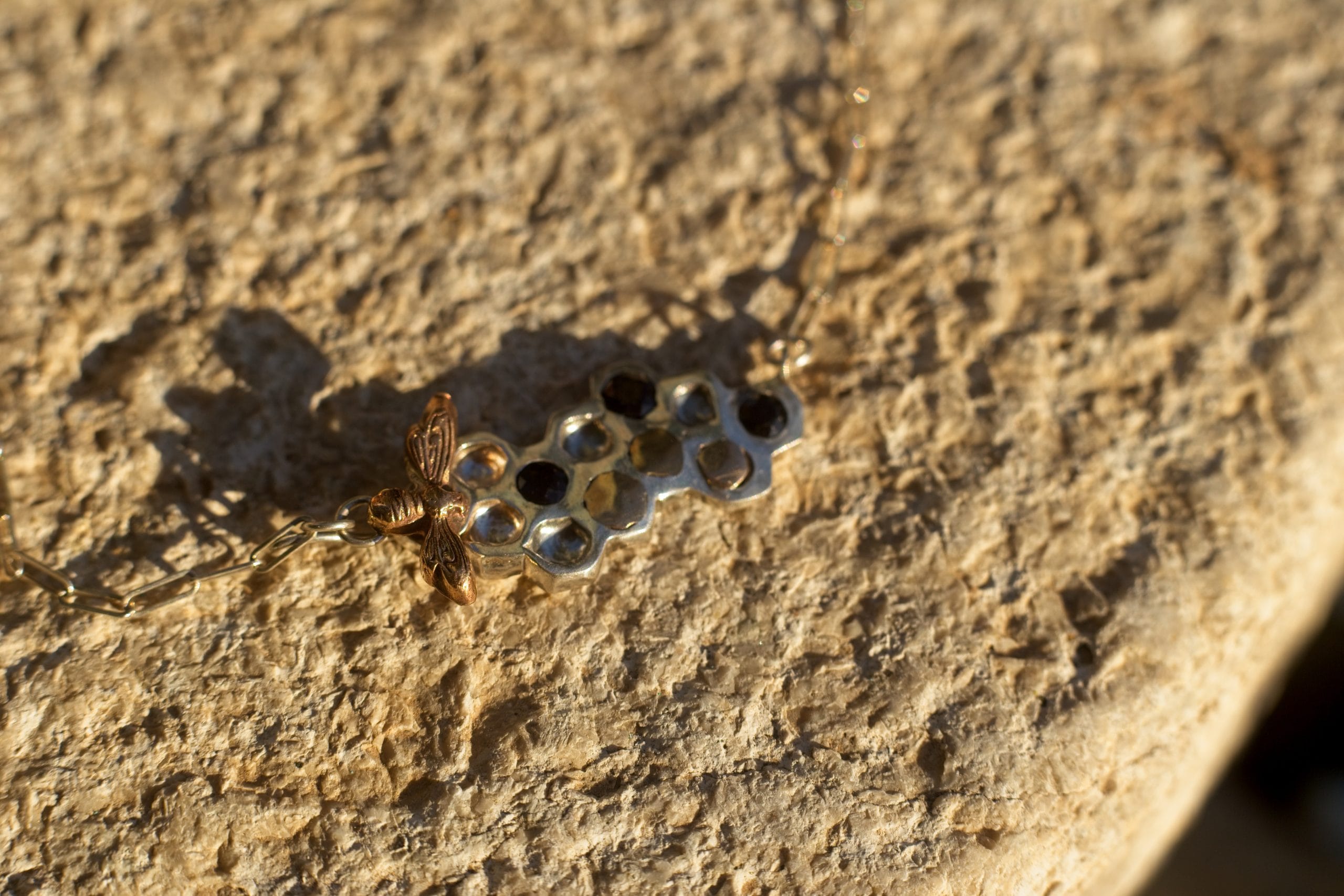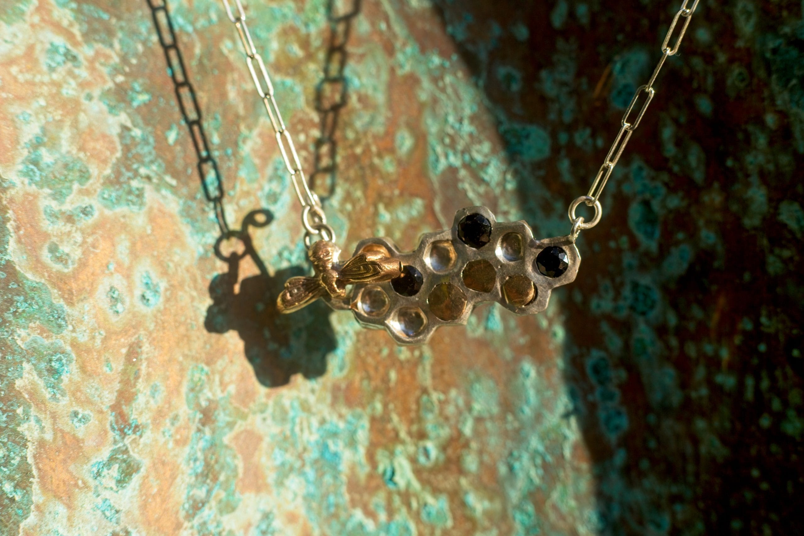 This luxurious statement piece captures the delicate geometry of the beehive in fine silver. The intricate honeycomb is richly detailed with accents of solid gold—a mix of 9-carat and 14-carat gold ‘honey’—creating a captivating, multi-tonal effect.