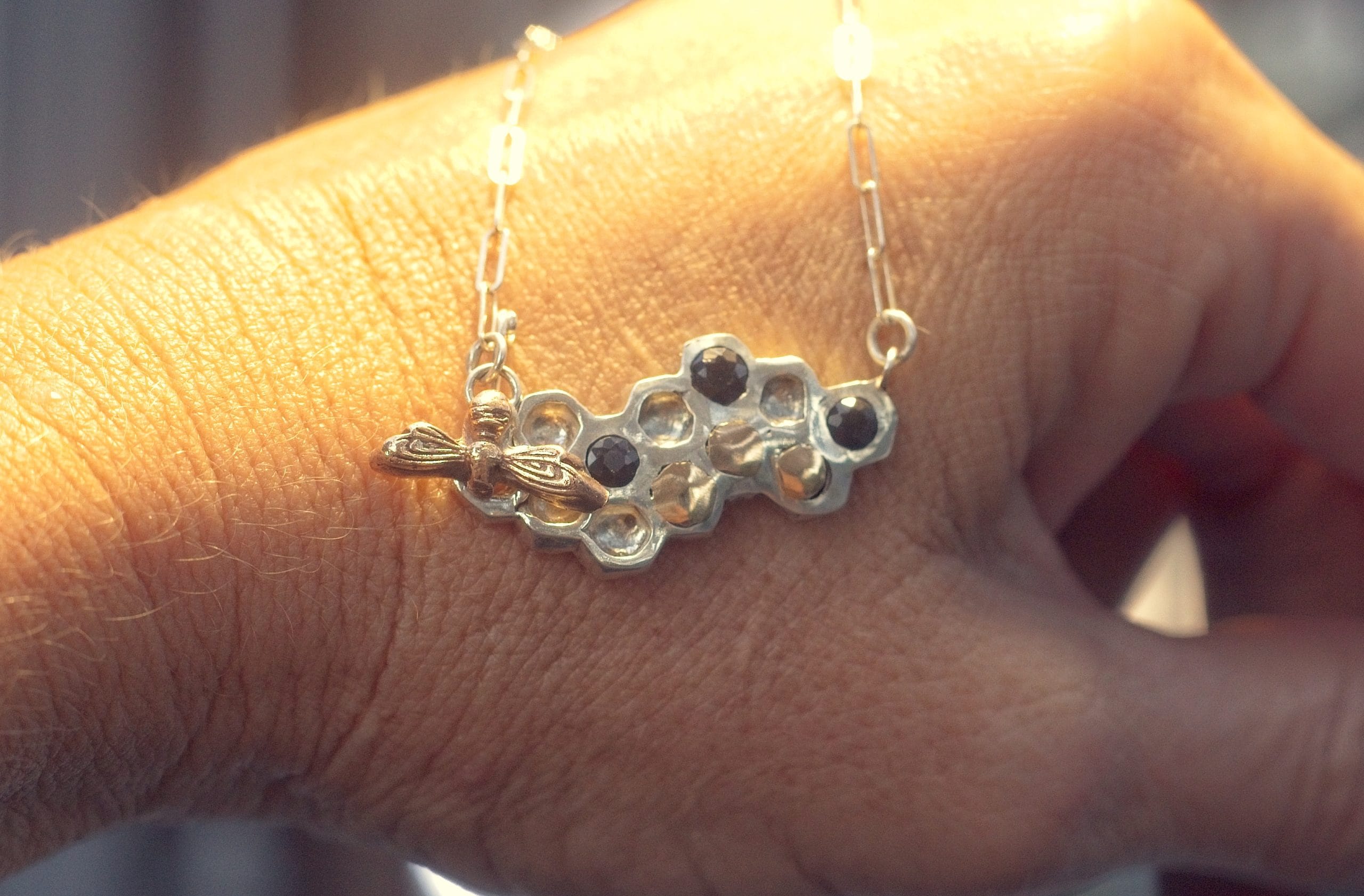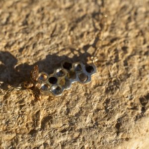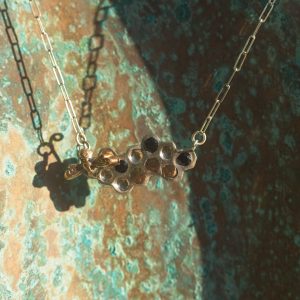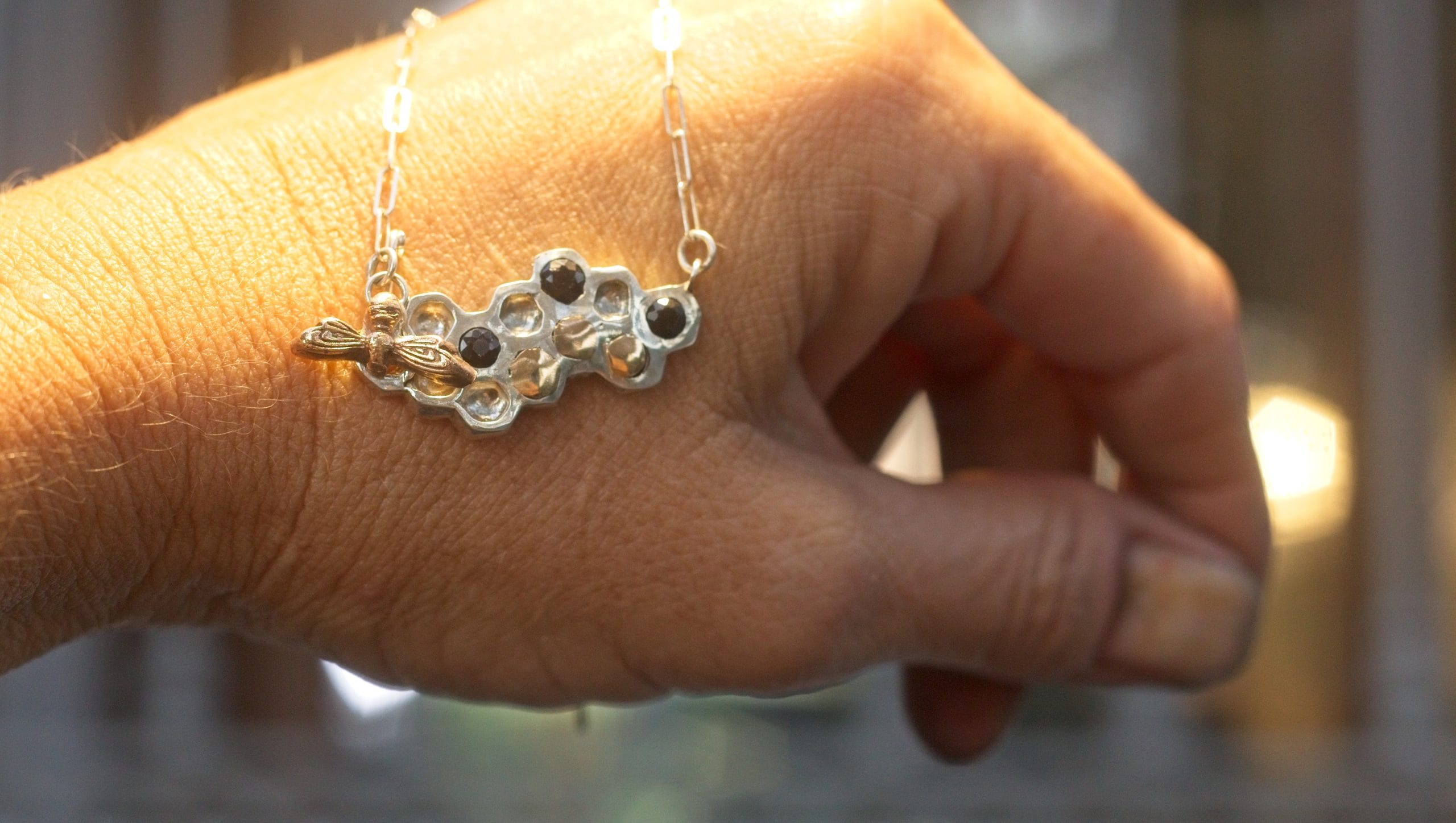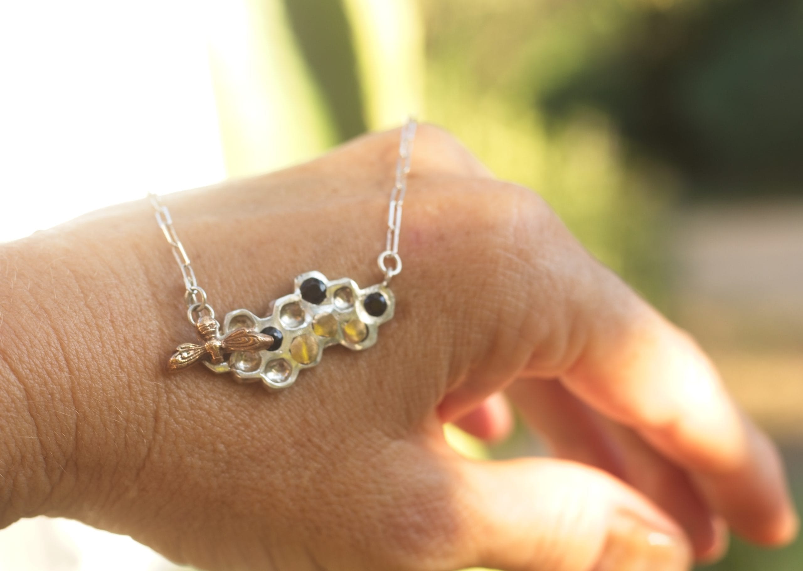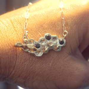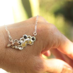 This luxurious statement piece captures the delicate geometry of the beehive in fine silver. The intricate honeycomb is richly detailed with accents of solid gold—a mix of 9-carat and 14-carat gold ‘honey’—creating a captivating, multi-tonal effect.