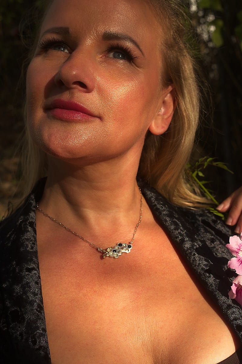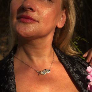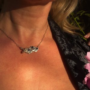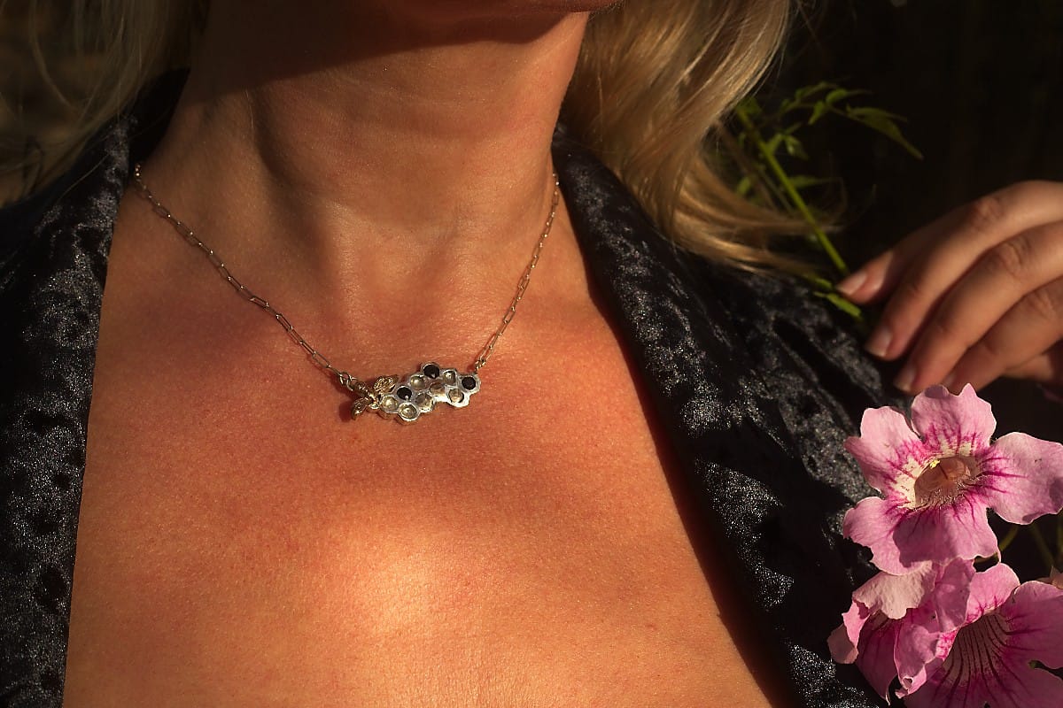 Three brilliant faceted sapphires are nestled within the matrix, adding a flash of rich blue colour. The necklace hangs from a modern sterling silver paperclip chain and fastens with a sculptural bronze bee clasp, making it a unique and unforgettable piece of wearable art.