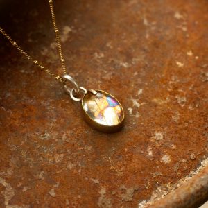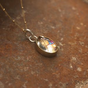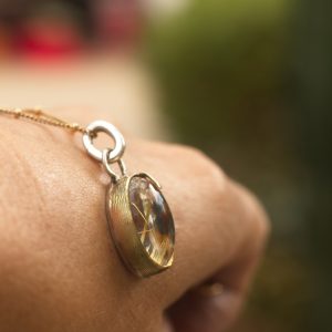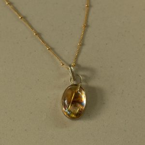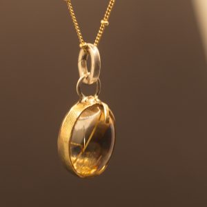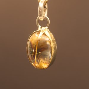 For maximum impact, the stone’s backing has been treated with an extra layer of fine silver leaf and heavily oxidised, resulting in deep, intense golden hues that make the internal rutile threads utterly glow. This pendant is a singular piece of wearable art, rich in texture and radiant energy.