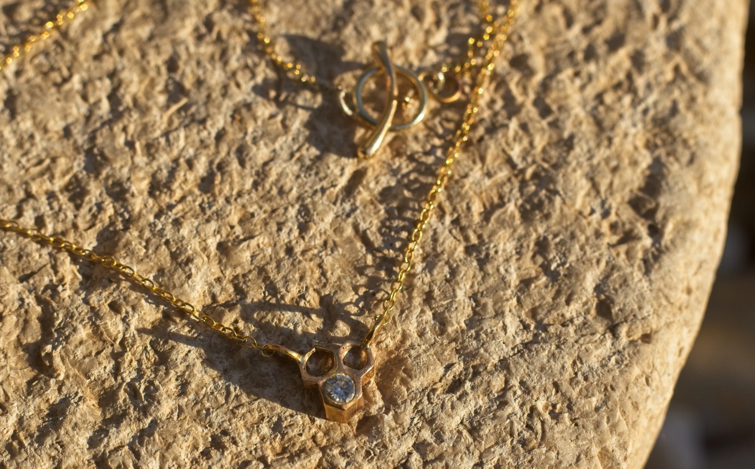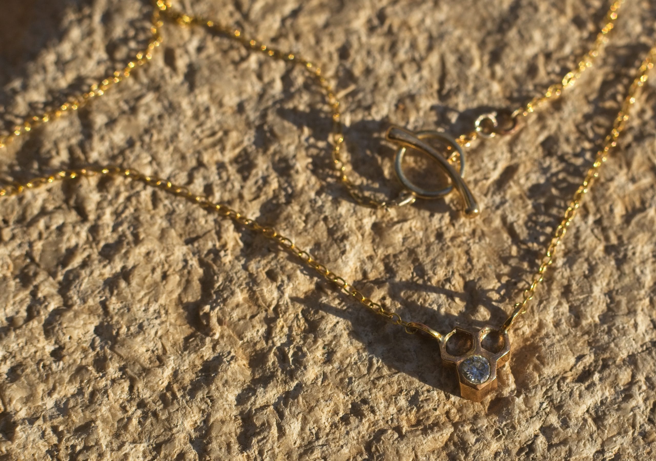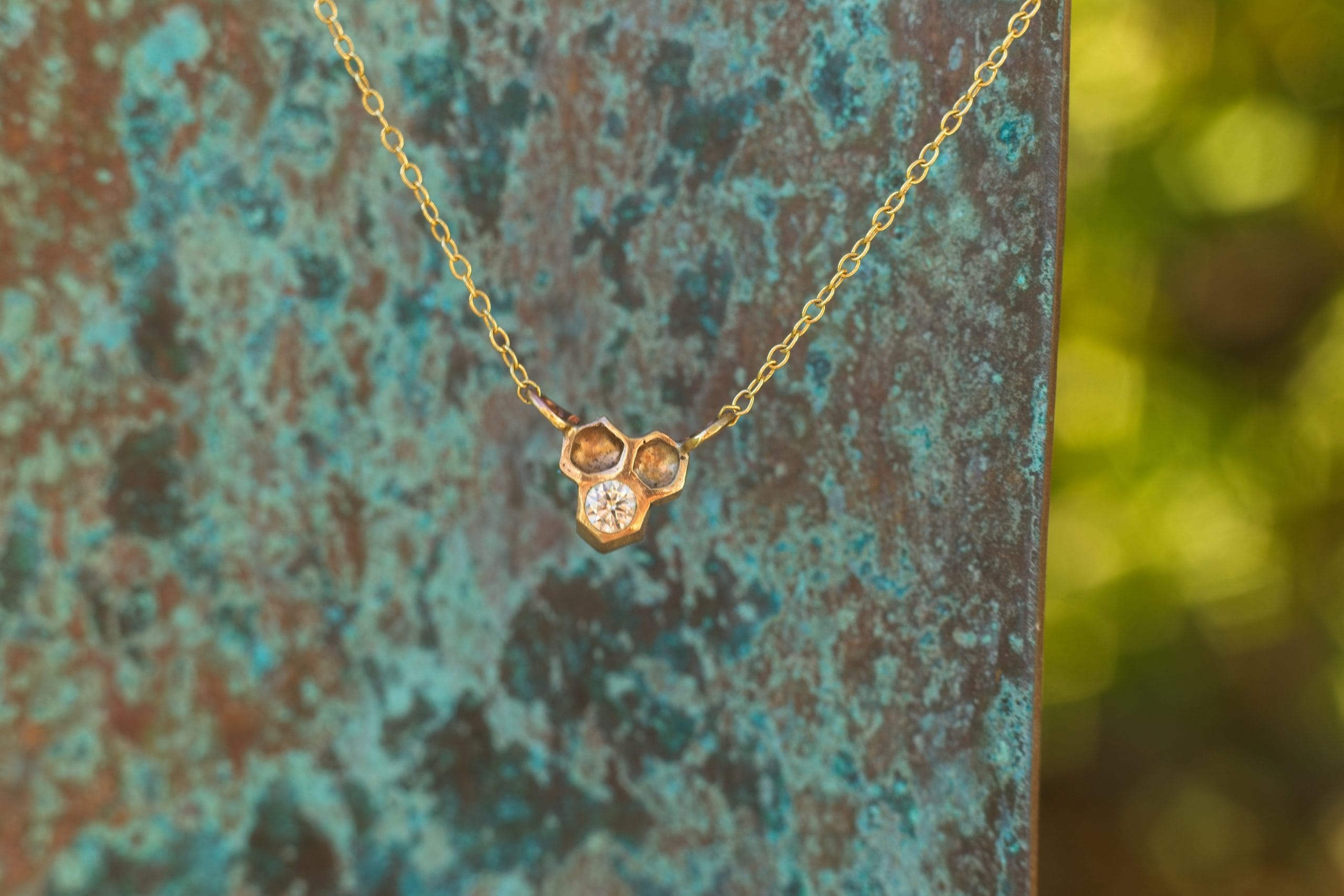 Inspired by the delicate geometry of nature, the Nectar Drip Necklace features a tiny, perfect honeycomb section cast in warm golden bronze.