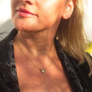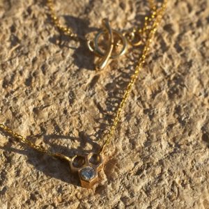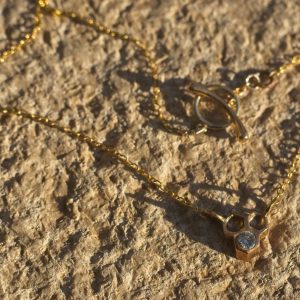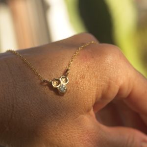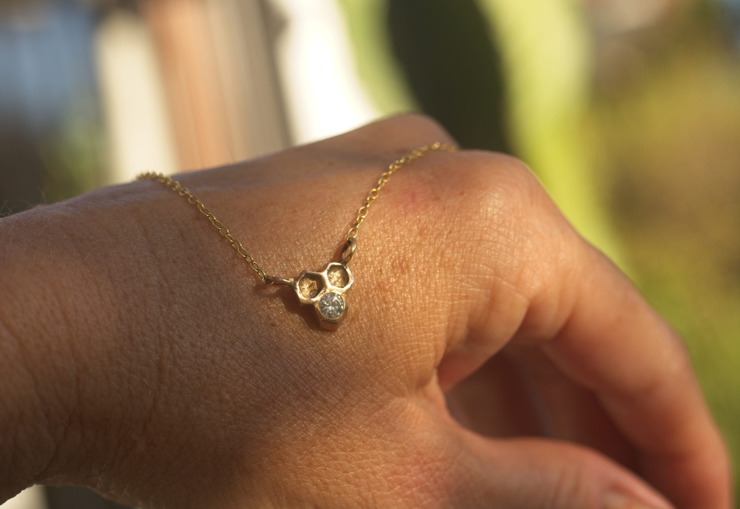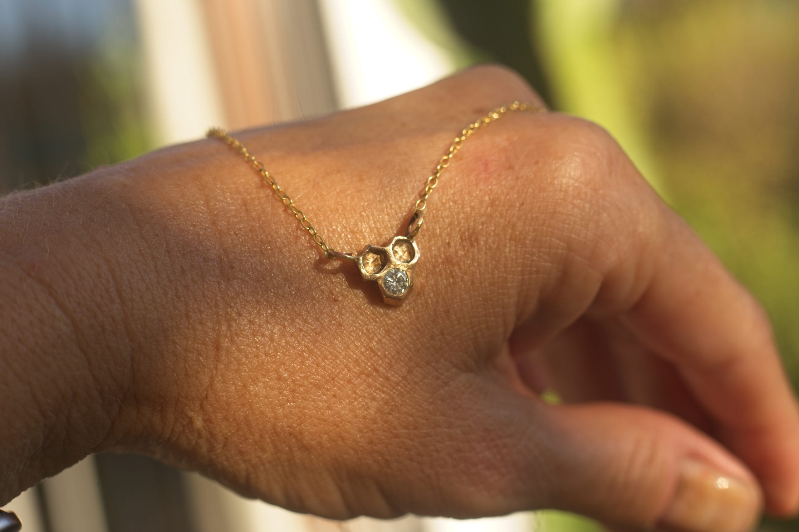 Inspired by the delicate geometry of nature, the Nectar Drip Necklace features a tiny, perfect honeycomb section cast in warm golden bronze.